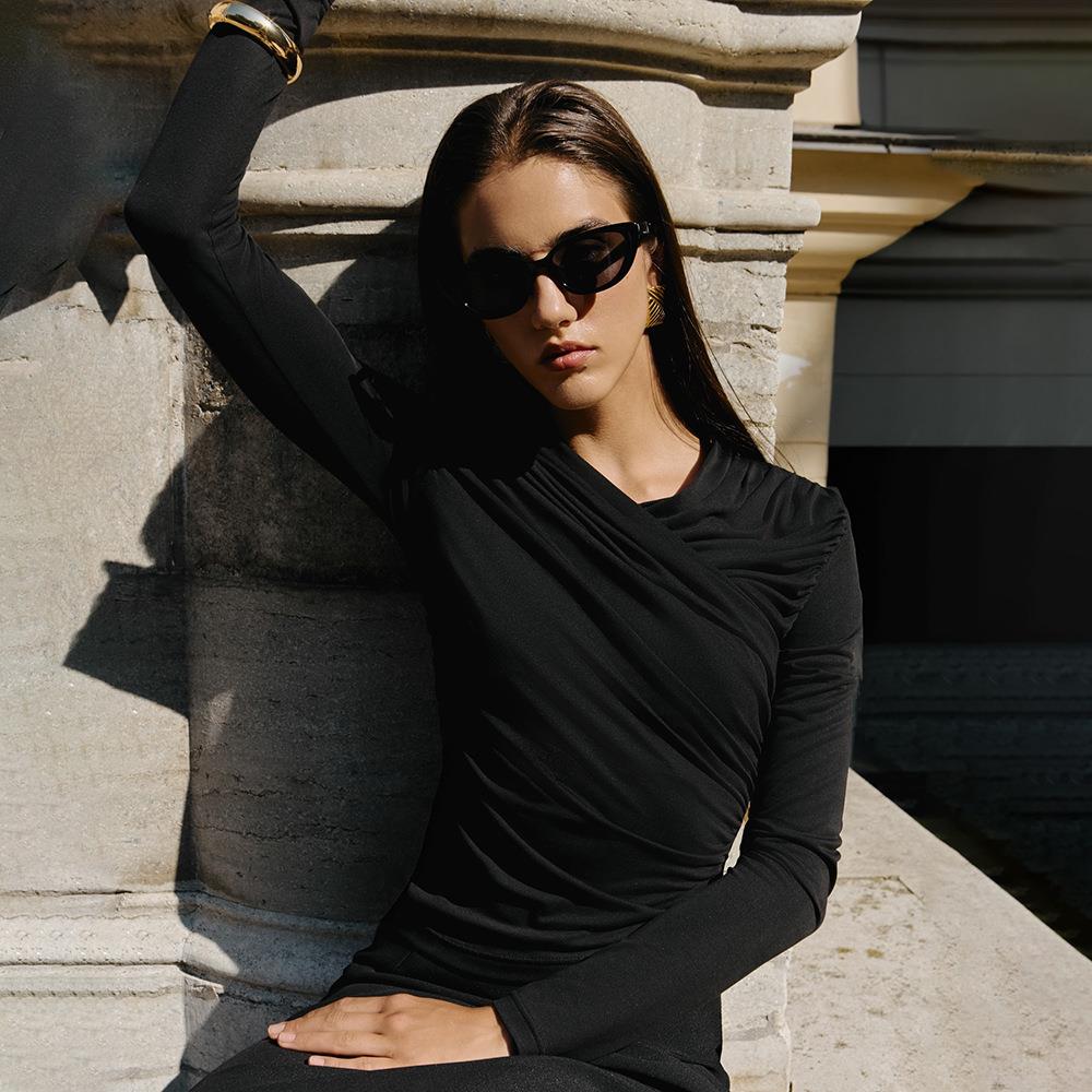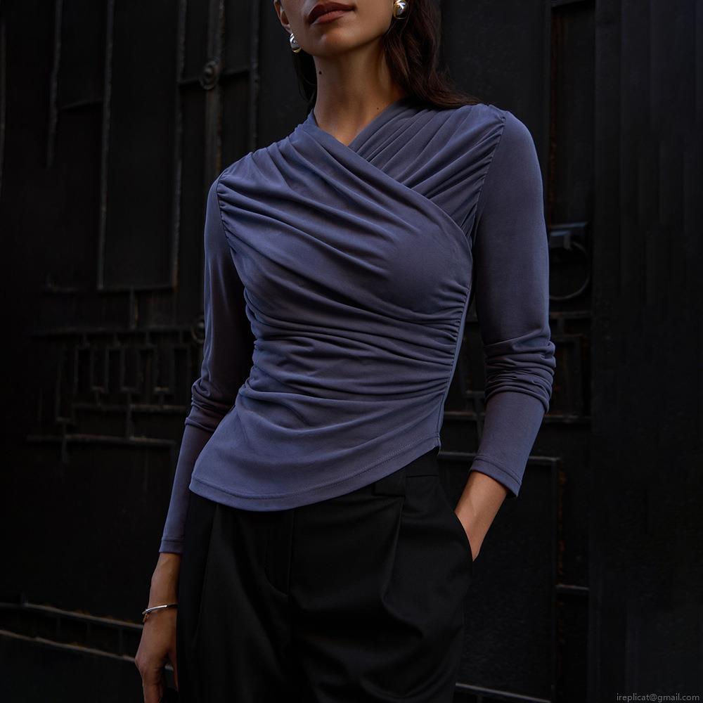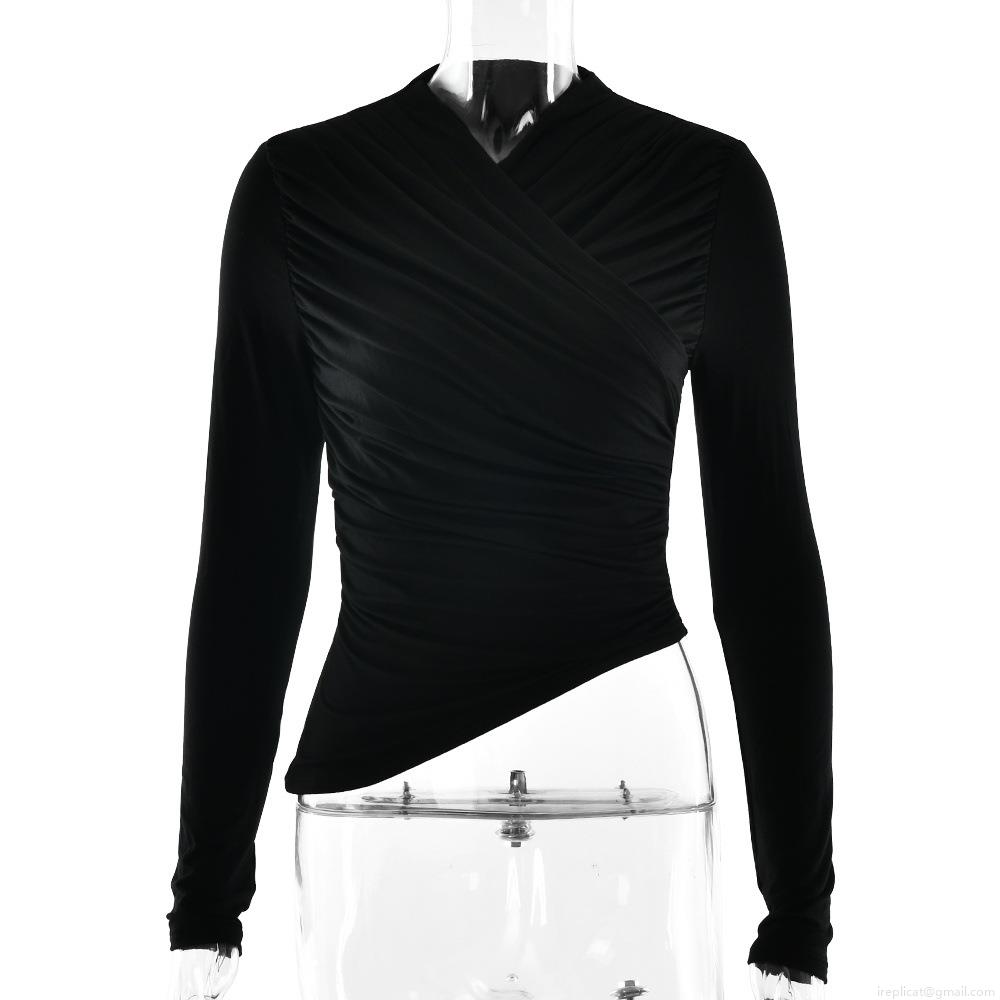 • Women's Sexy Ruched V-Neck Slim Fit Long Sleeve T-Shirt Solid Color Modal Fiber Bodycon Top Elegant Asymmetric Hem Streetwear Tee