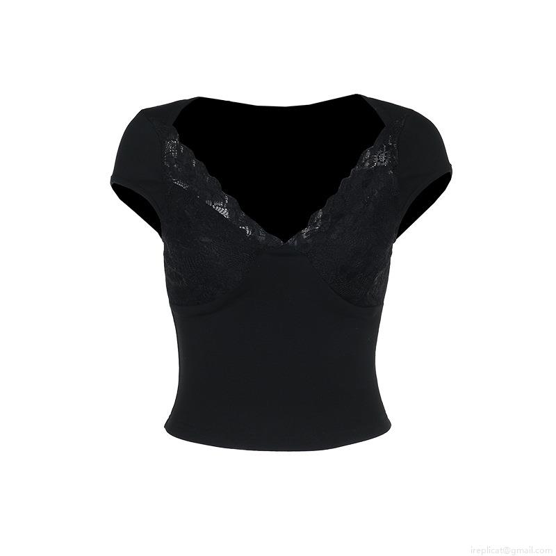Women's Sexy Slim Fit Lace Patchwork V-Neck Crop Top Short Sleeve Polyester Spandex Ribbed T-Shirt Streetwear Y2K Aesthetic Summer Tee