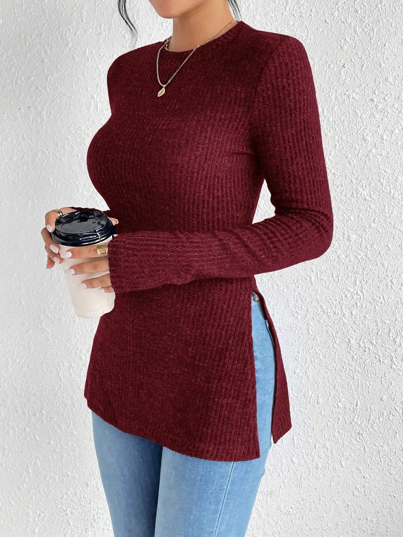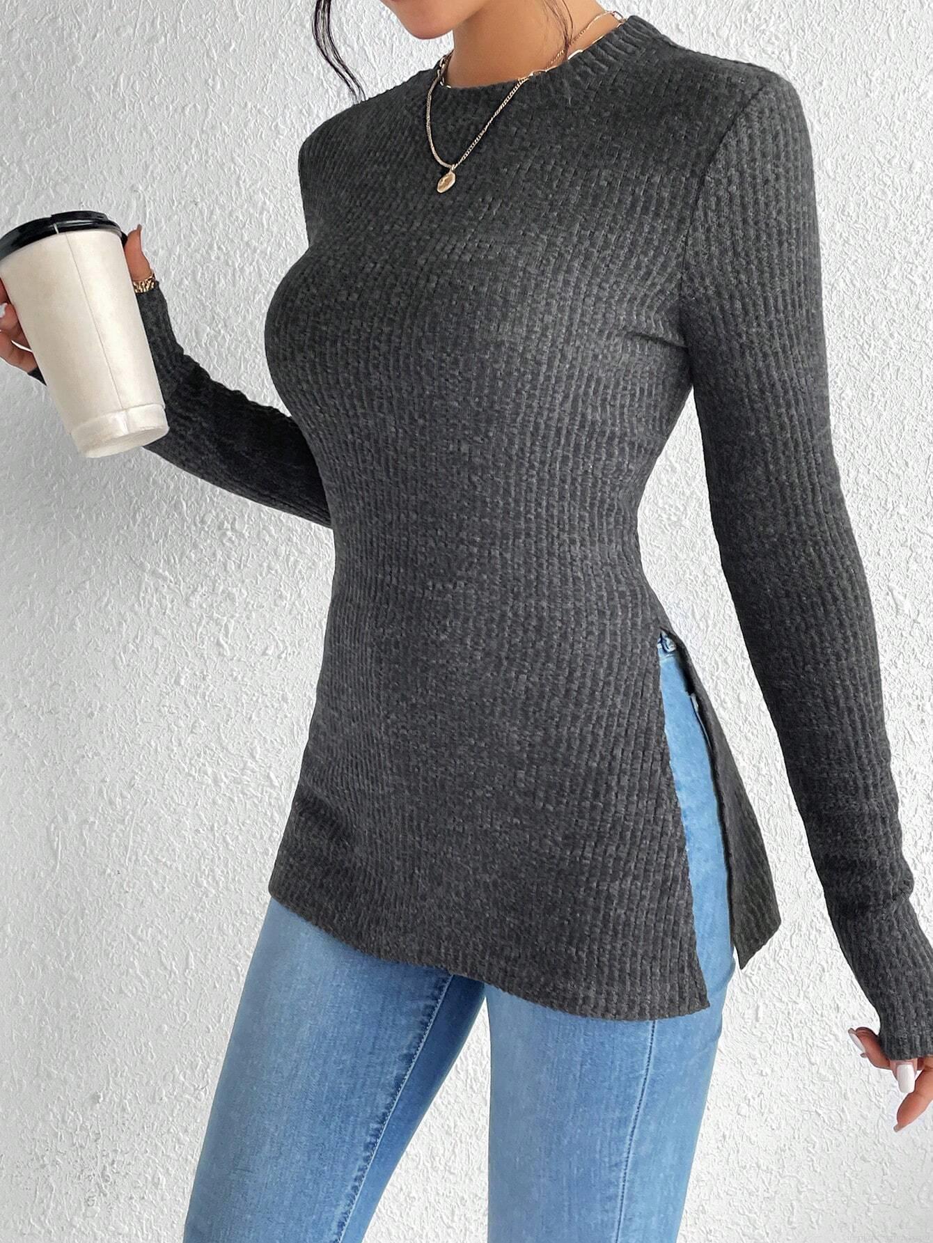 • Women's Sexy Slim Fit Ribbed Knit T-Shirt Long Sleeve Round Neck Side Slit Brushed Solid Color Top For Casual Commuting Autumn Polyester Spandex