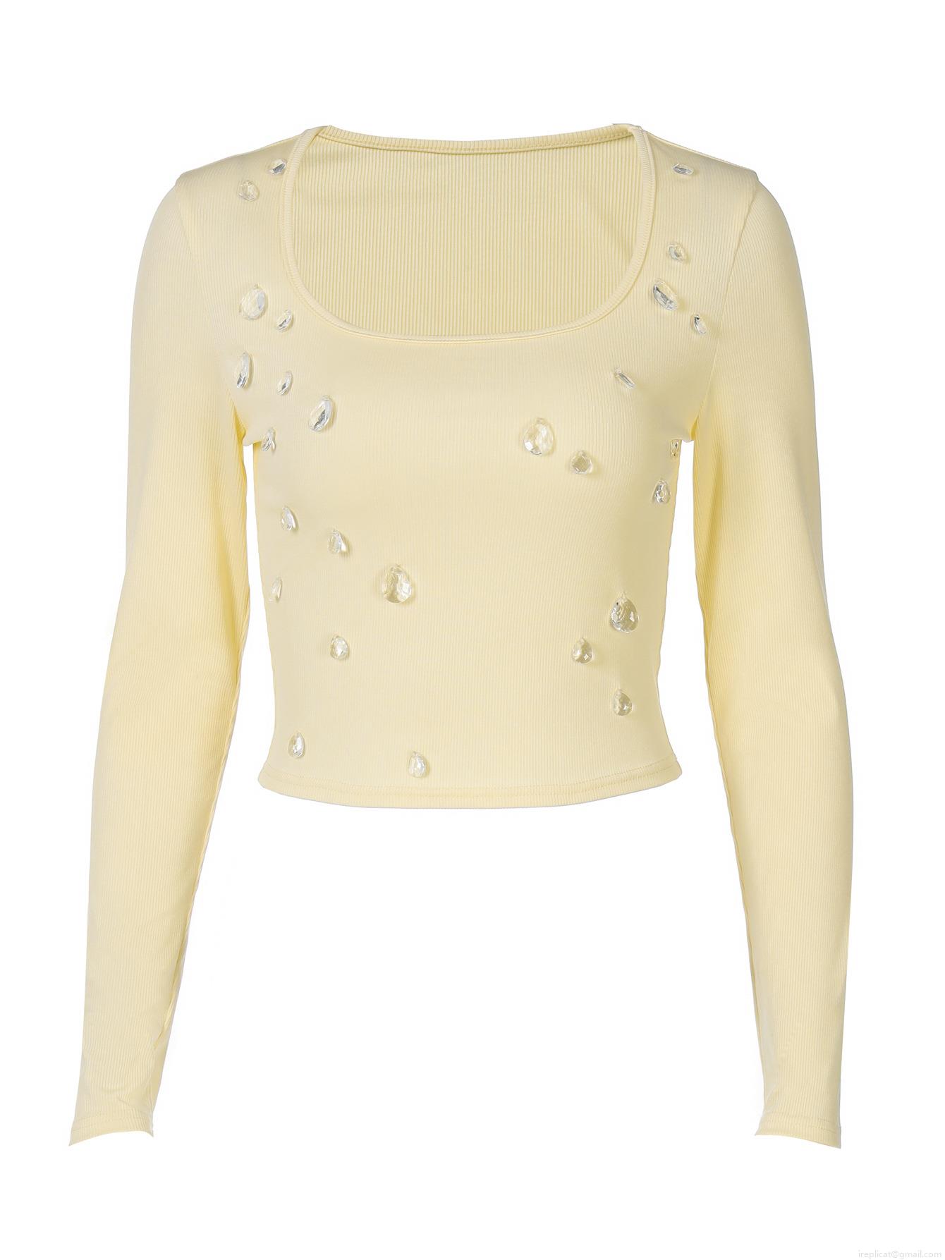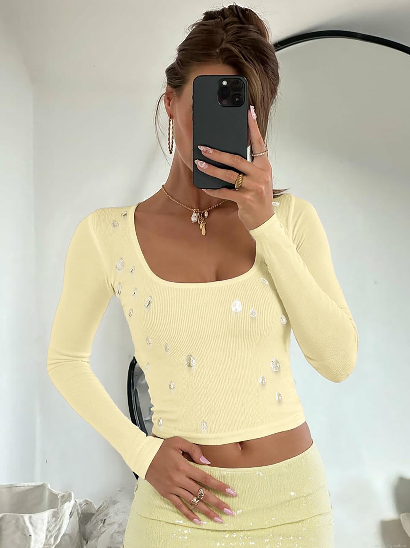 • Women's Sexy Slim Fit U-Neck Long Sleeve Crop Top Ribbed Knit T-Shirt With Waterdrop Rhinestones Fashion Streetwear Party Tee