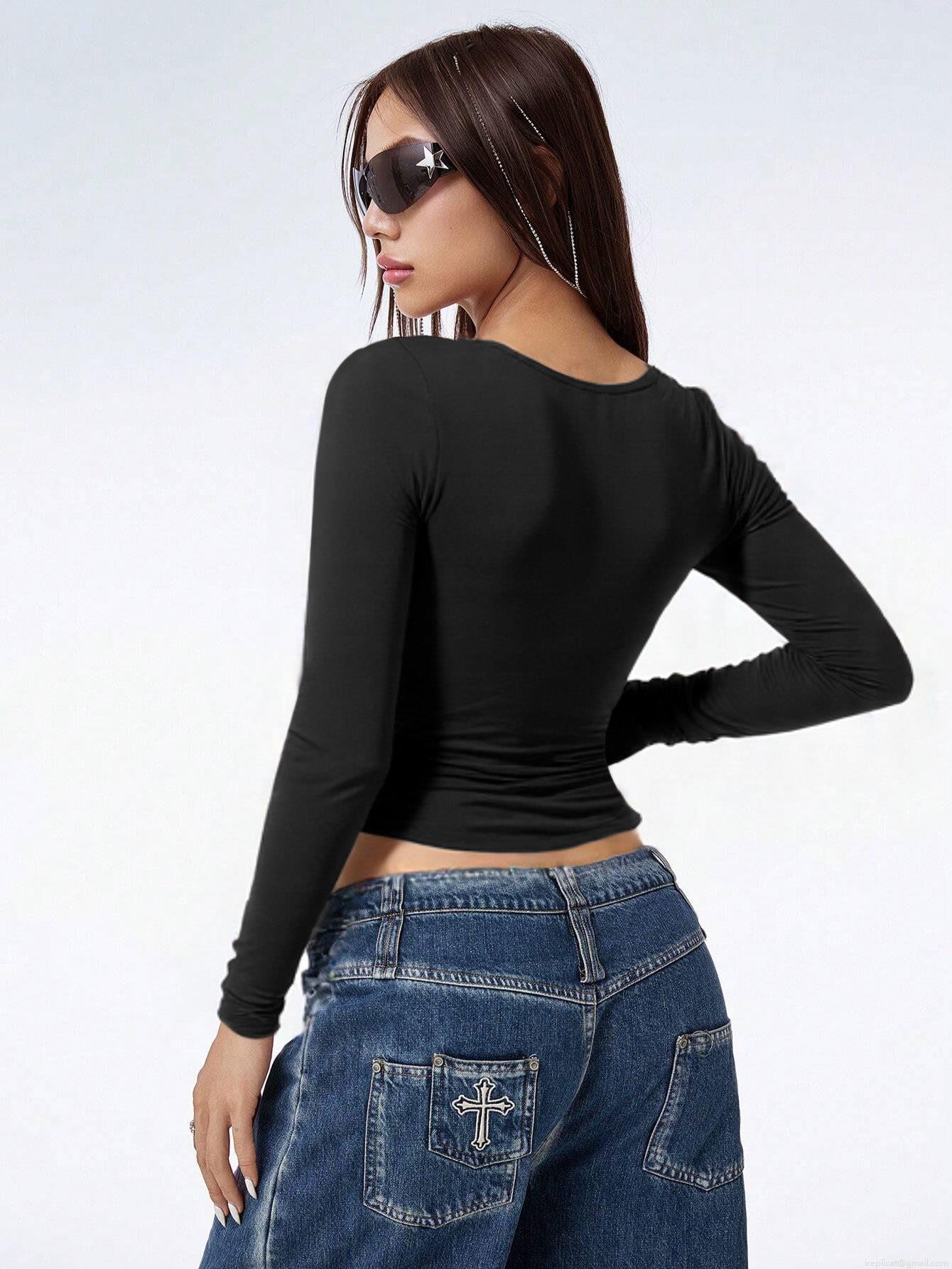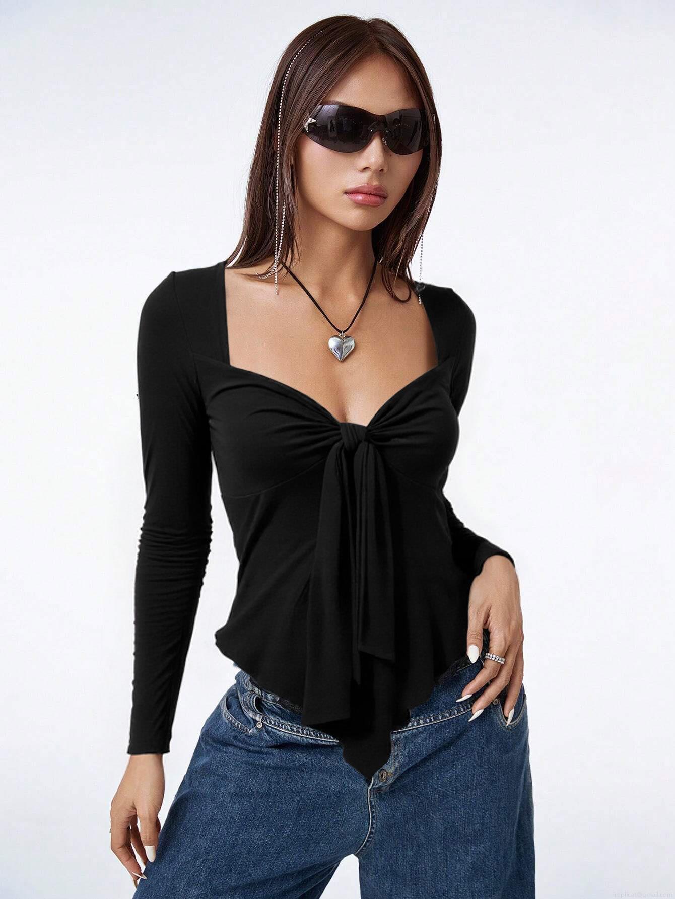 • Women's Sexy Slim Fit V Neck Long Sleeve T-Shirt Solid Black Tie Front Knot Crop Top Casual Spicy Girl Style Pullover Tee for Women