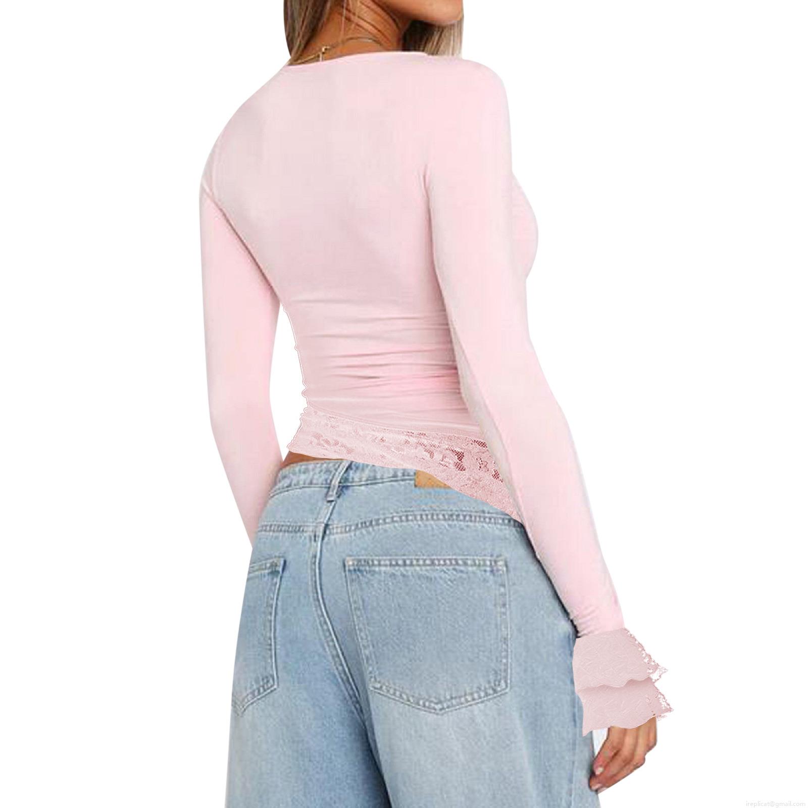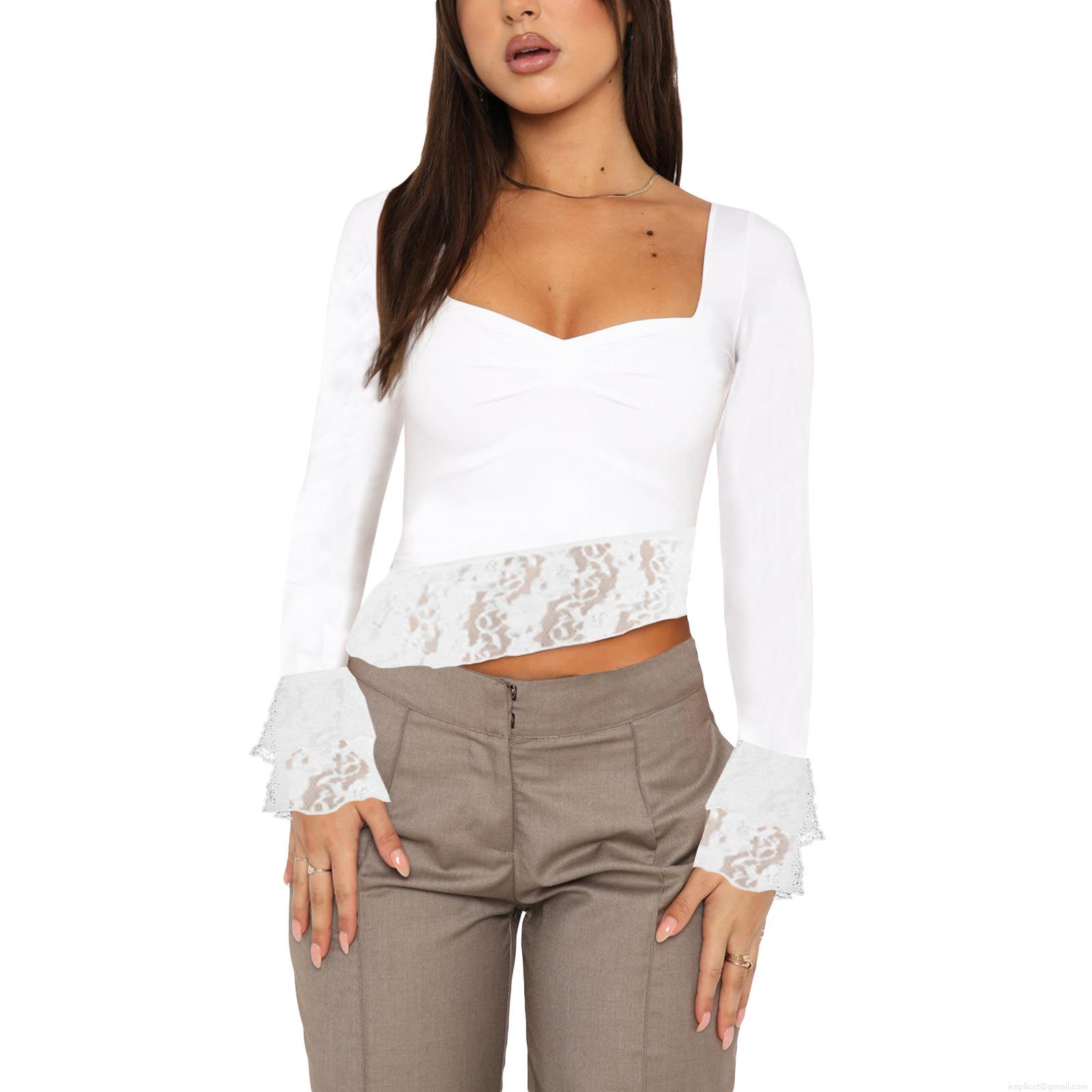 • Women's Sexy Square Neck Lace Patchwork Top Fashion Slim Fit Long Bell Sleeve T-Shirt Streetwear Polyester Spandex Solid Color Irregular Hem Blouse