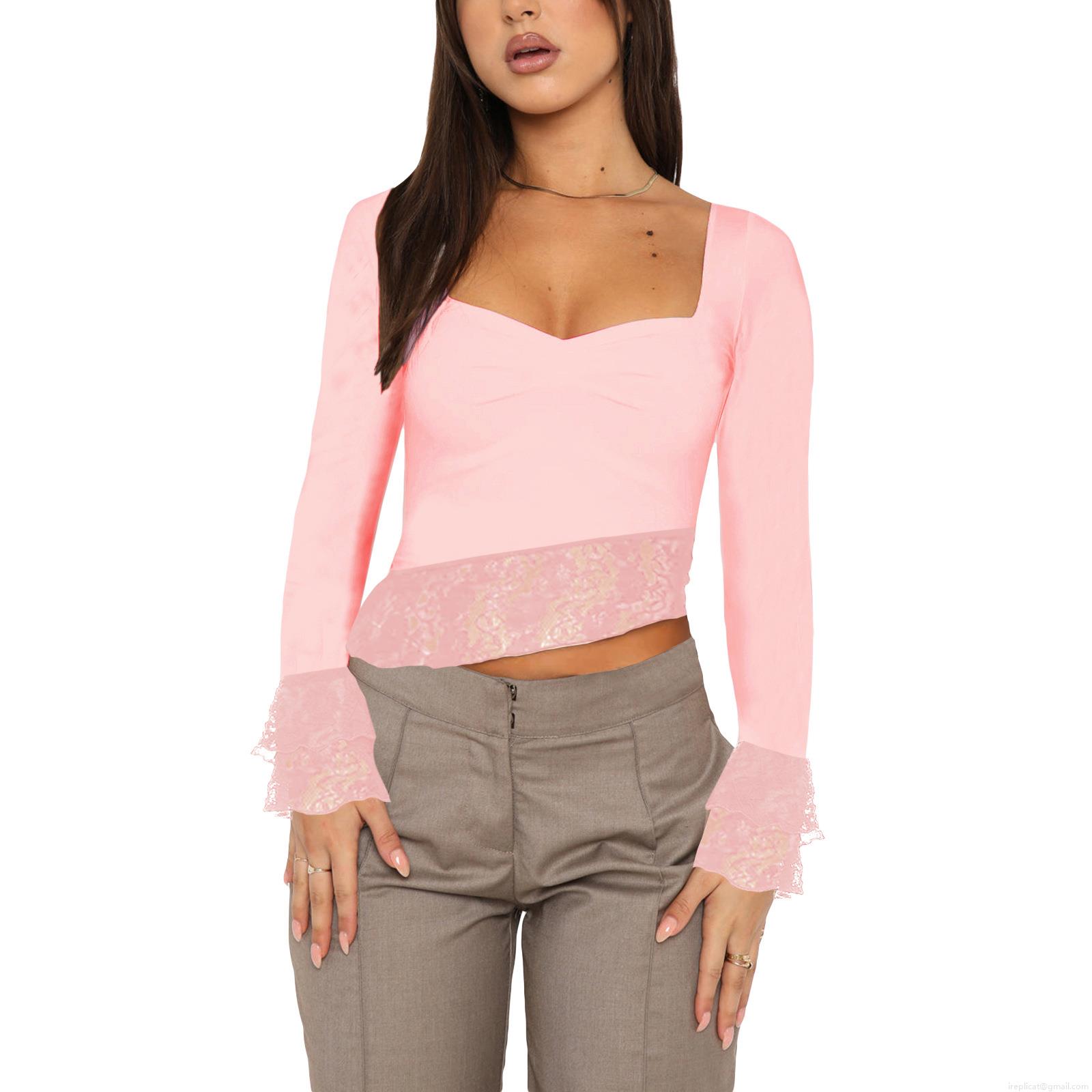 Women's Sexy Square Neck Lace Patchwork Top Fashion Slim Fit Long Bell Sleeve T-Shirt Streetwear Polyester Spandex Solid Color Irregular Hem Blouse