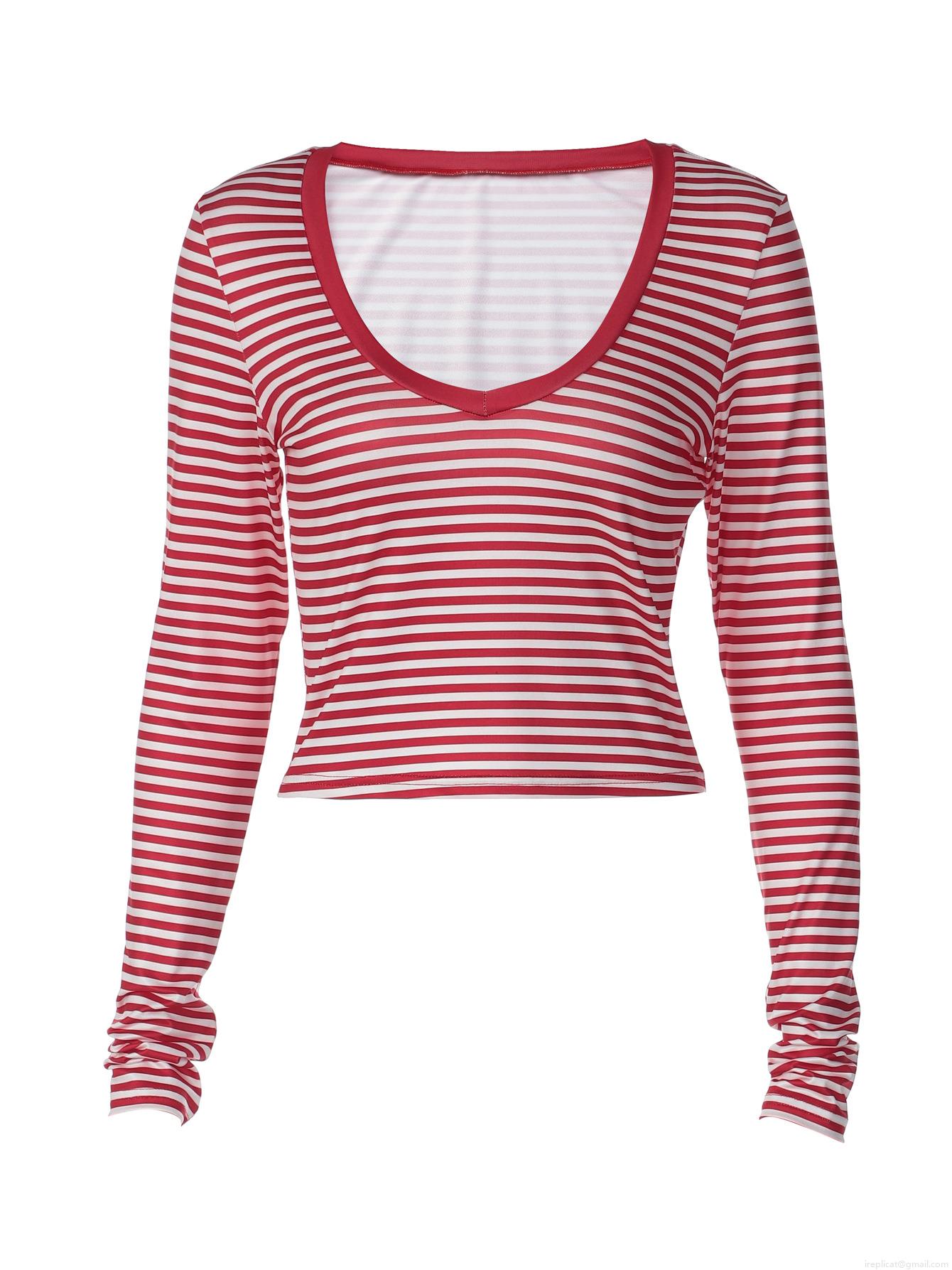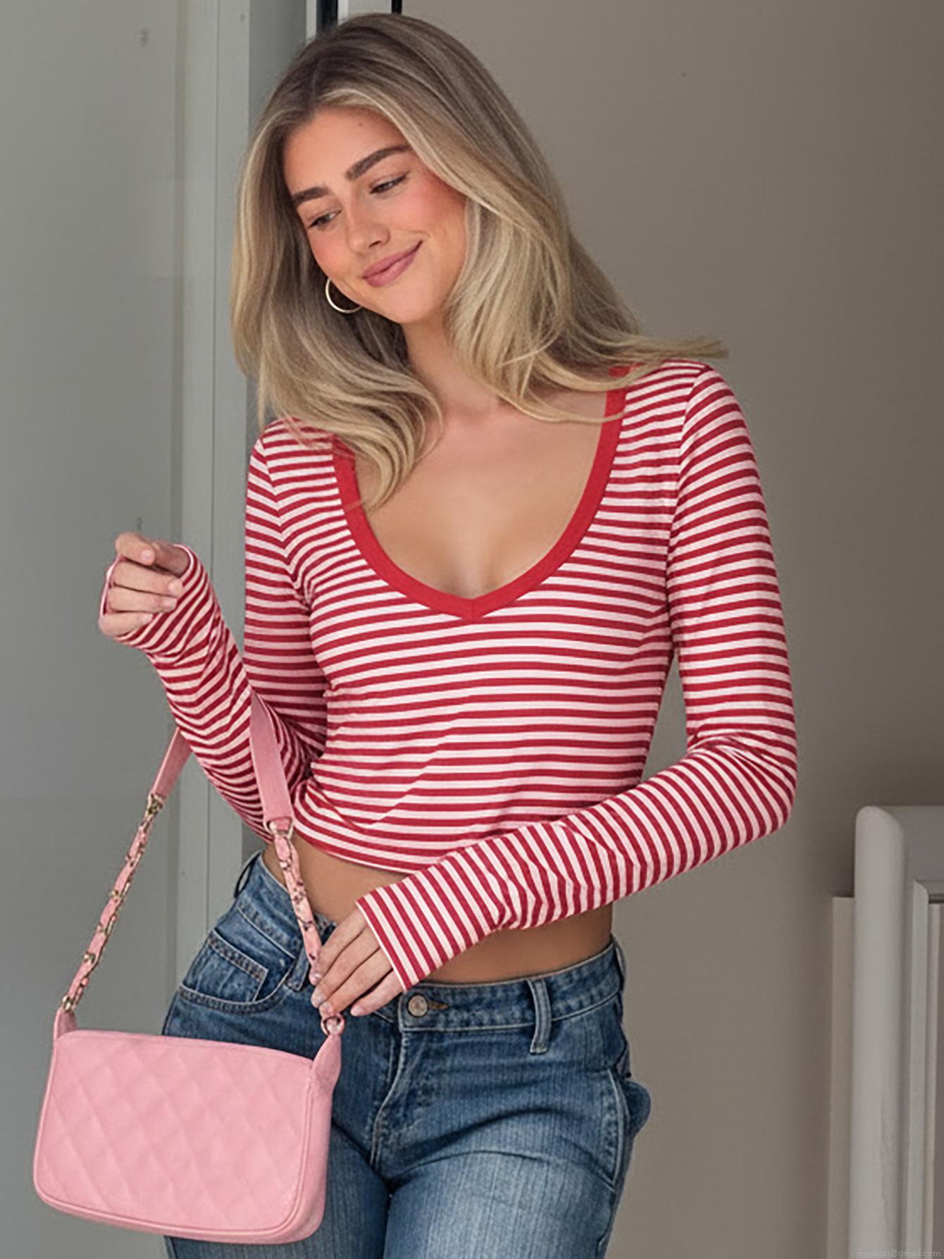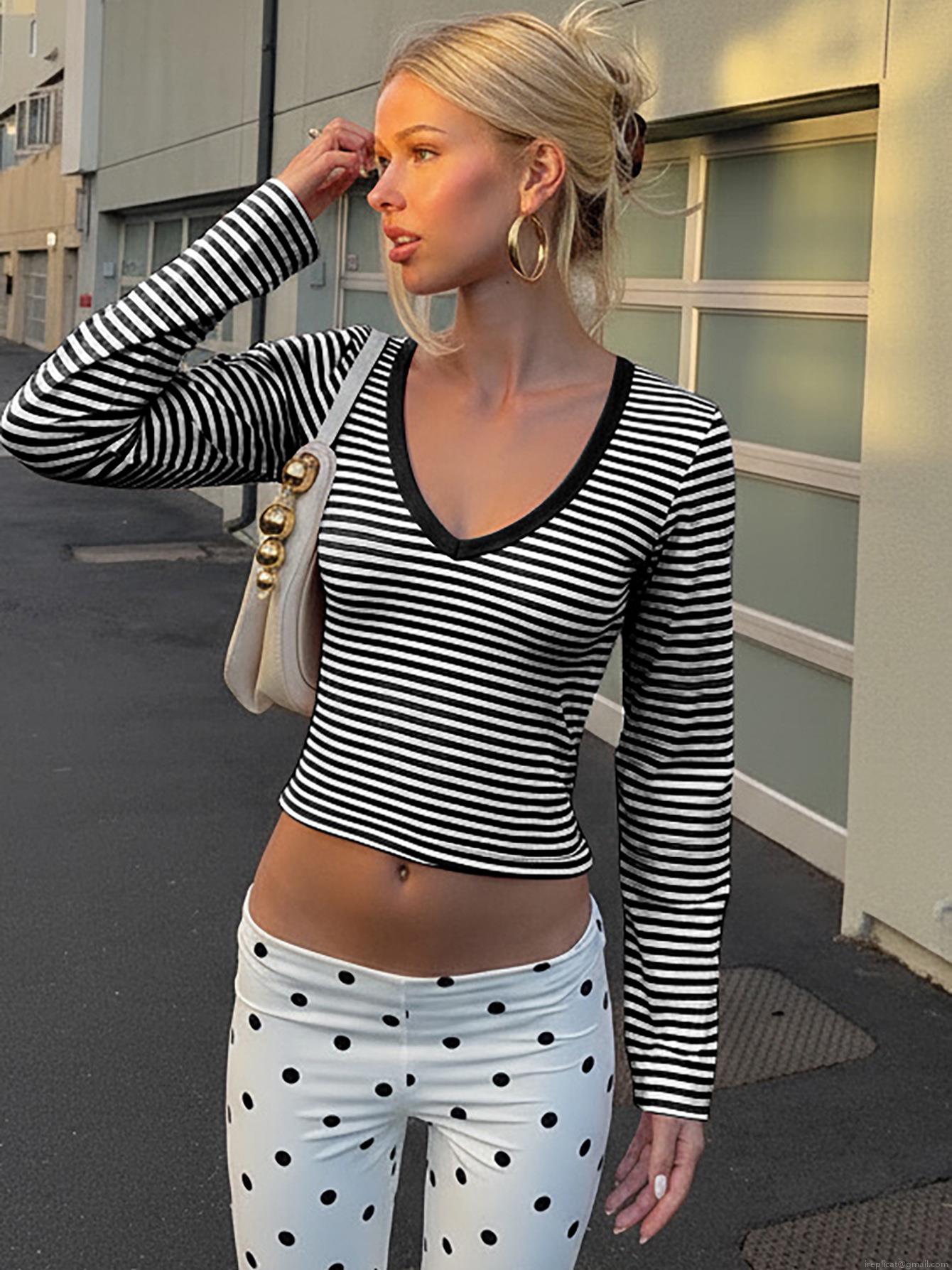 • Women's Sexy Striped V-Neck Long Sleeve Crop Top Polyester Spandex Slim Fit Y2K Streetwear Tee Casual Fashion Pullover T-Shirt For Women