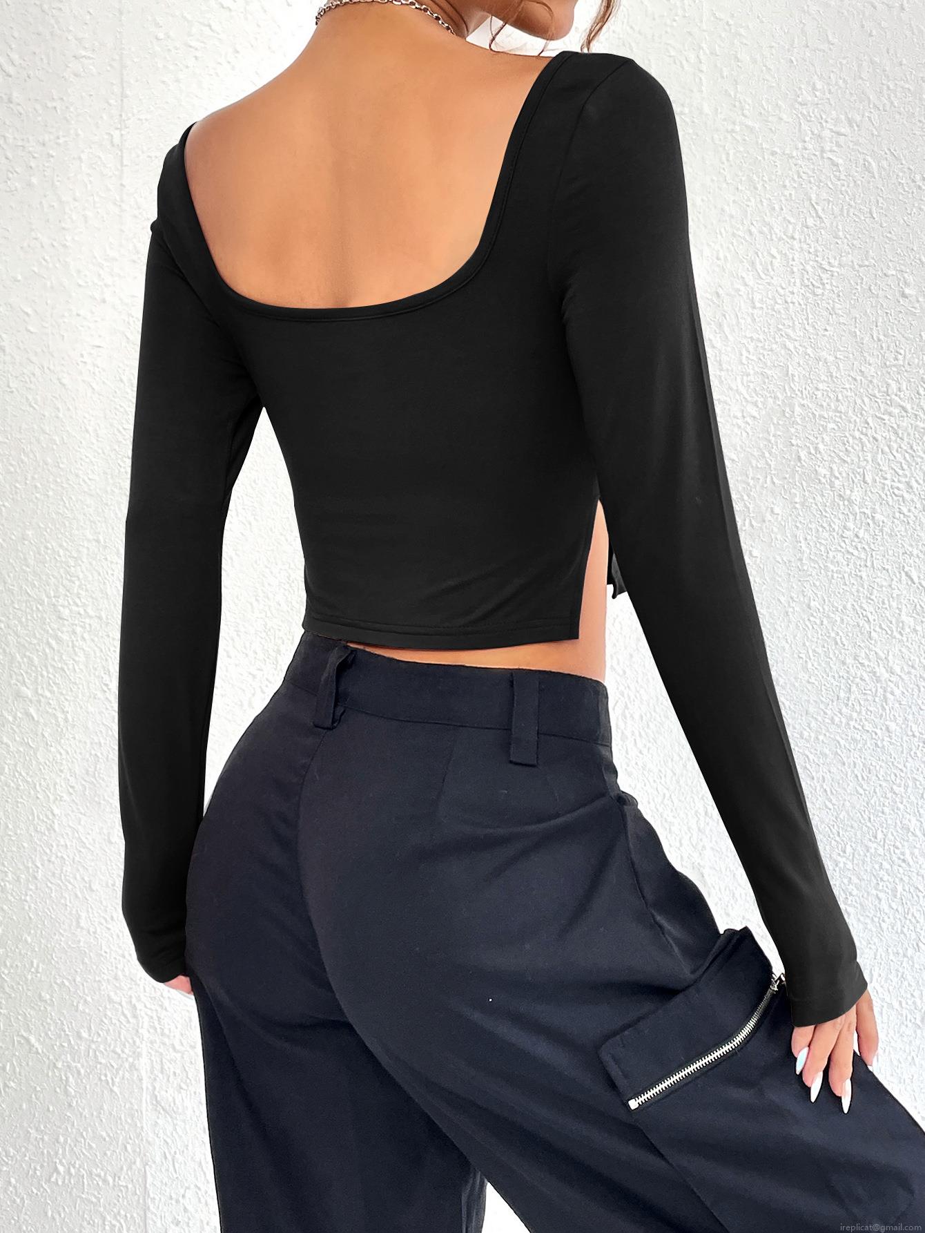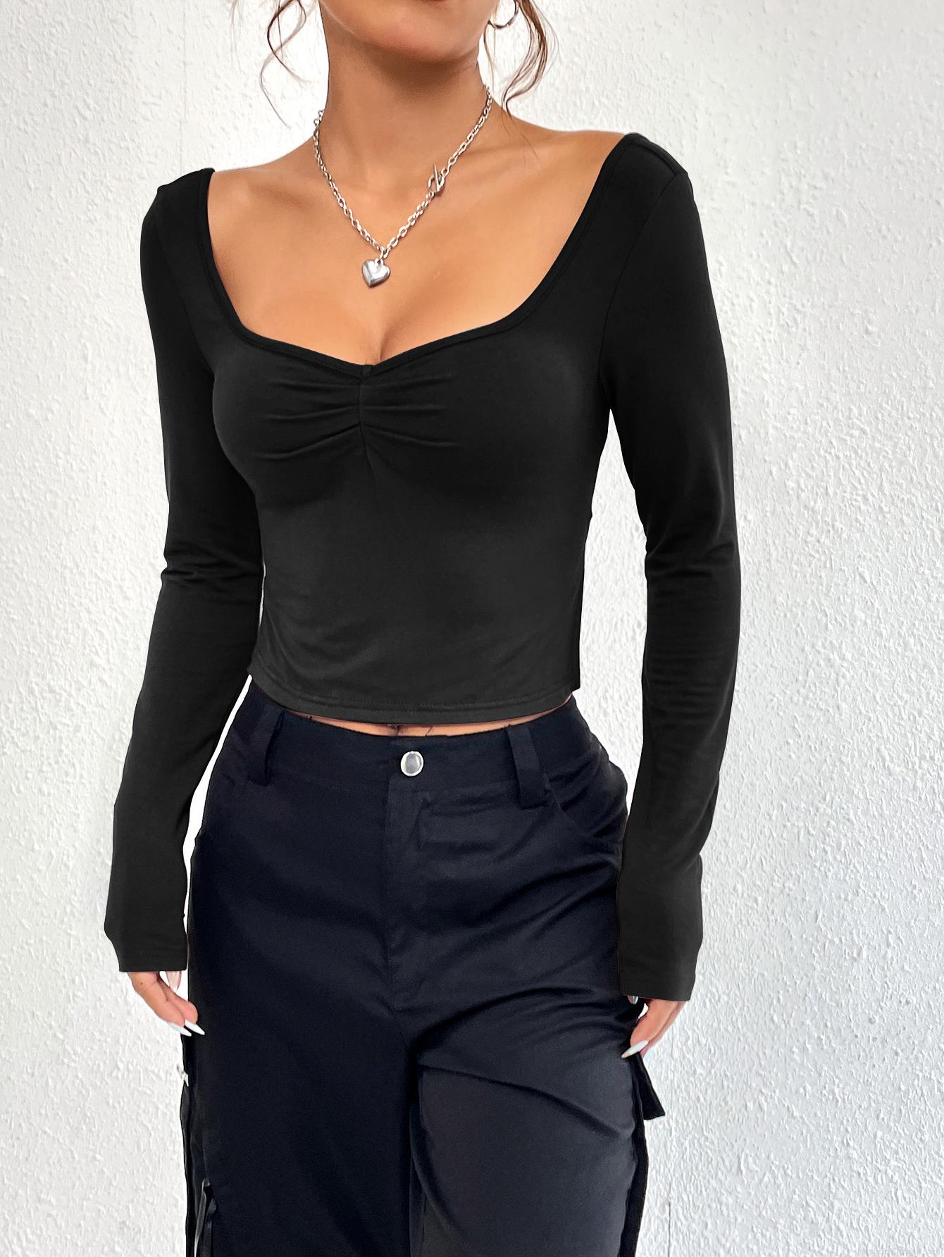 • Women's Sexy Sweetheart Neck Long Sleeve Crop Top Ruched Front Side Slit Slim Fit T-shirt Viscose Elastane Ribbed Knit Streetwear Party Tee