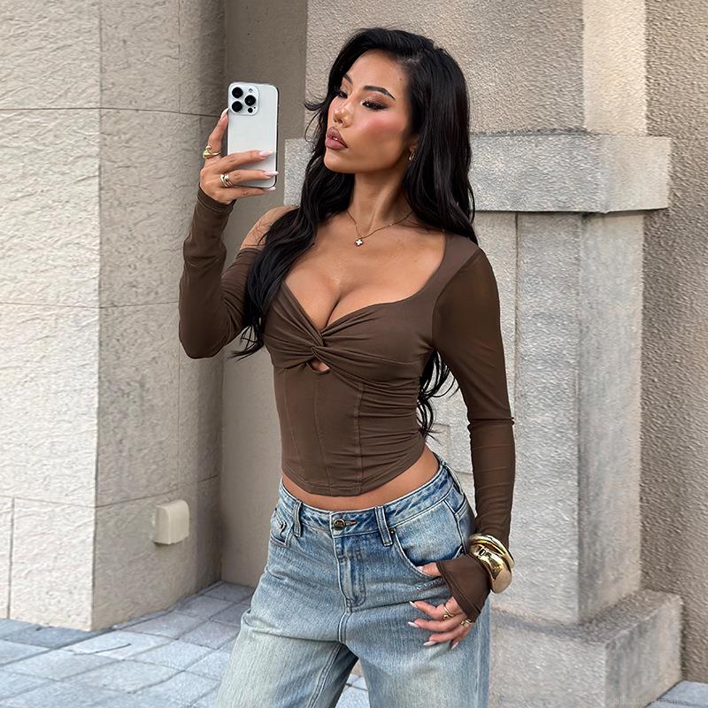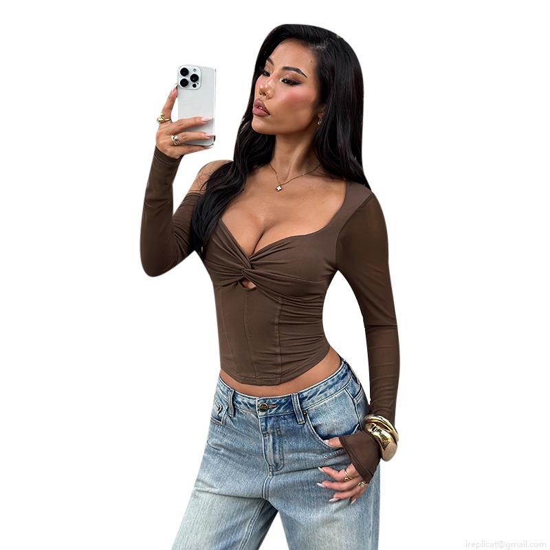 • Women's Sexy Twist Knot Cutout Crop Top Off Shoulder Mesh Long Sleeve Backless Tie Up Slim Fit Streetwear Polyester Mesh Patchwork T-Shirt