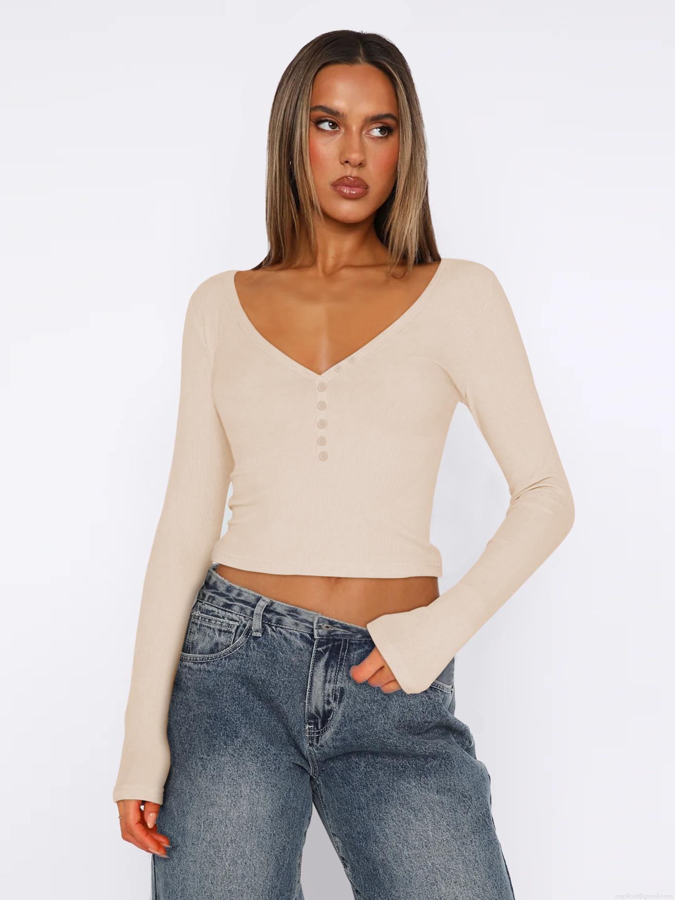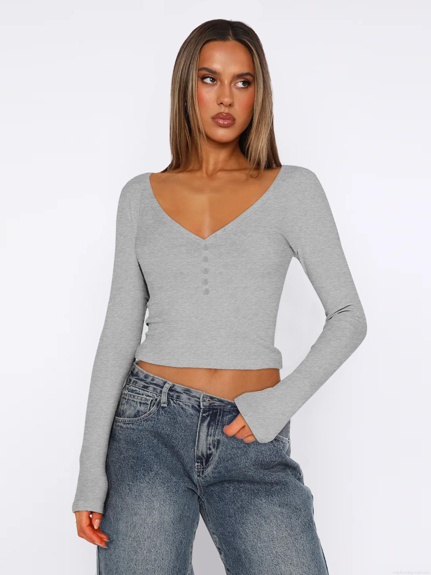 • Women's Sexy V Neck Button Front Ribbed Knit Crop Top Long Sleeve Slim Fit Solid Color Casual Viscose Blend T-Shirt Top
