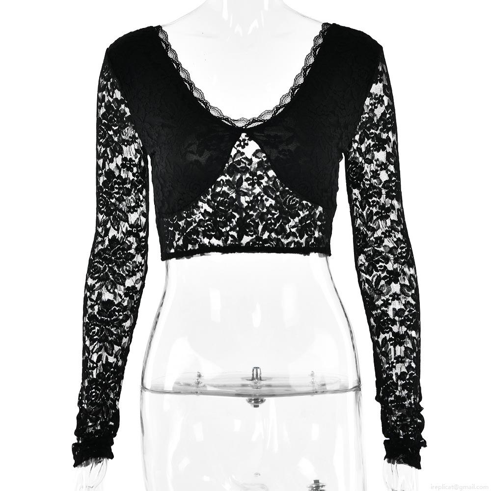 • Women's Sexy V Neck Lace Long Sleeve Crop Top Slim Fit Sheer Floral Backless Mesh T-Shirt Clubwear Streetwear Elegant White Black Party Top