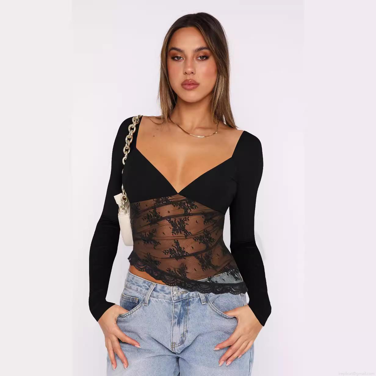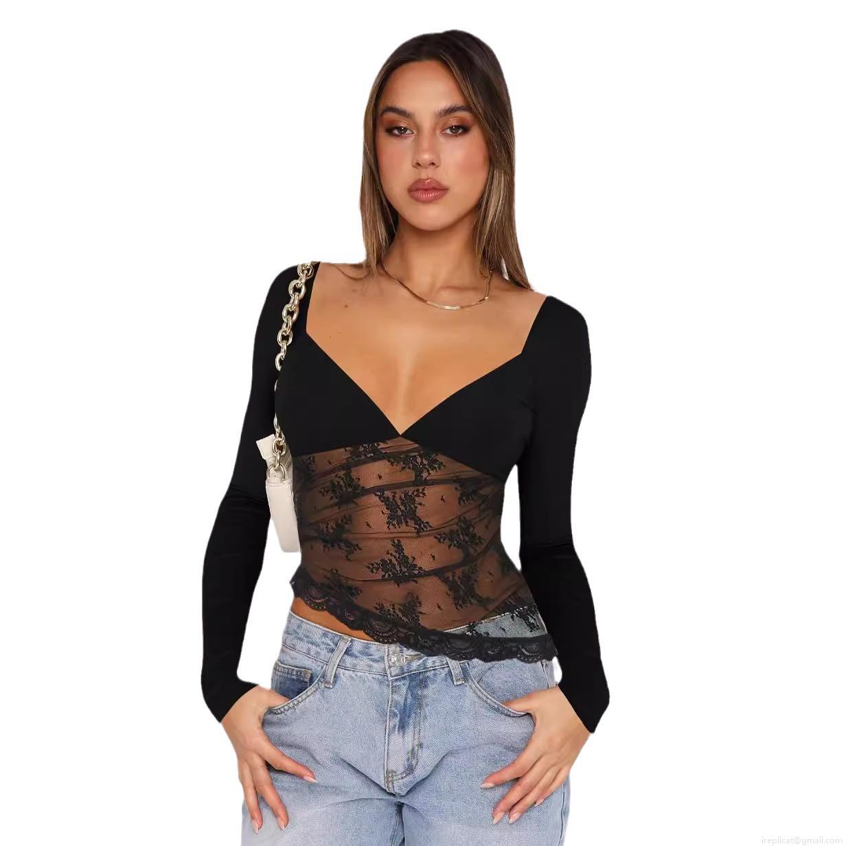 • Women's Sexy V Neck Lace Patchwork Top Long Sleeve Slim Fit Floral Lace Hem Solid Color T-Shirt Streetwear Casual Elegant Fall Clothing For Ladies