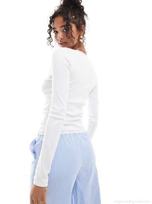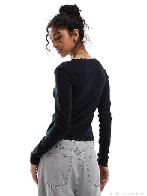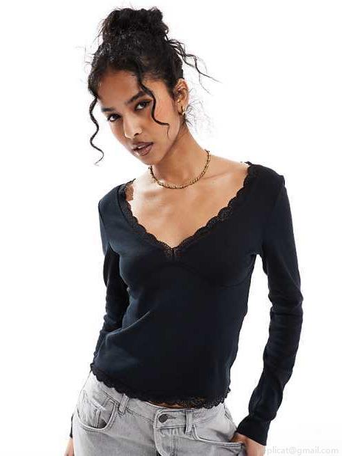 • Women's Sexy V Neck Lace Trim Long Sleeve Ribbed Crop Top Slim Fit Solid Color T-Shirt Streetwear Casual Basic Tee Tops for Spring Autumn Ladies