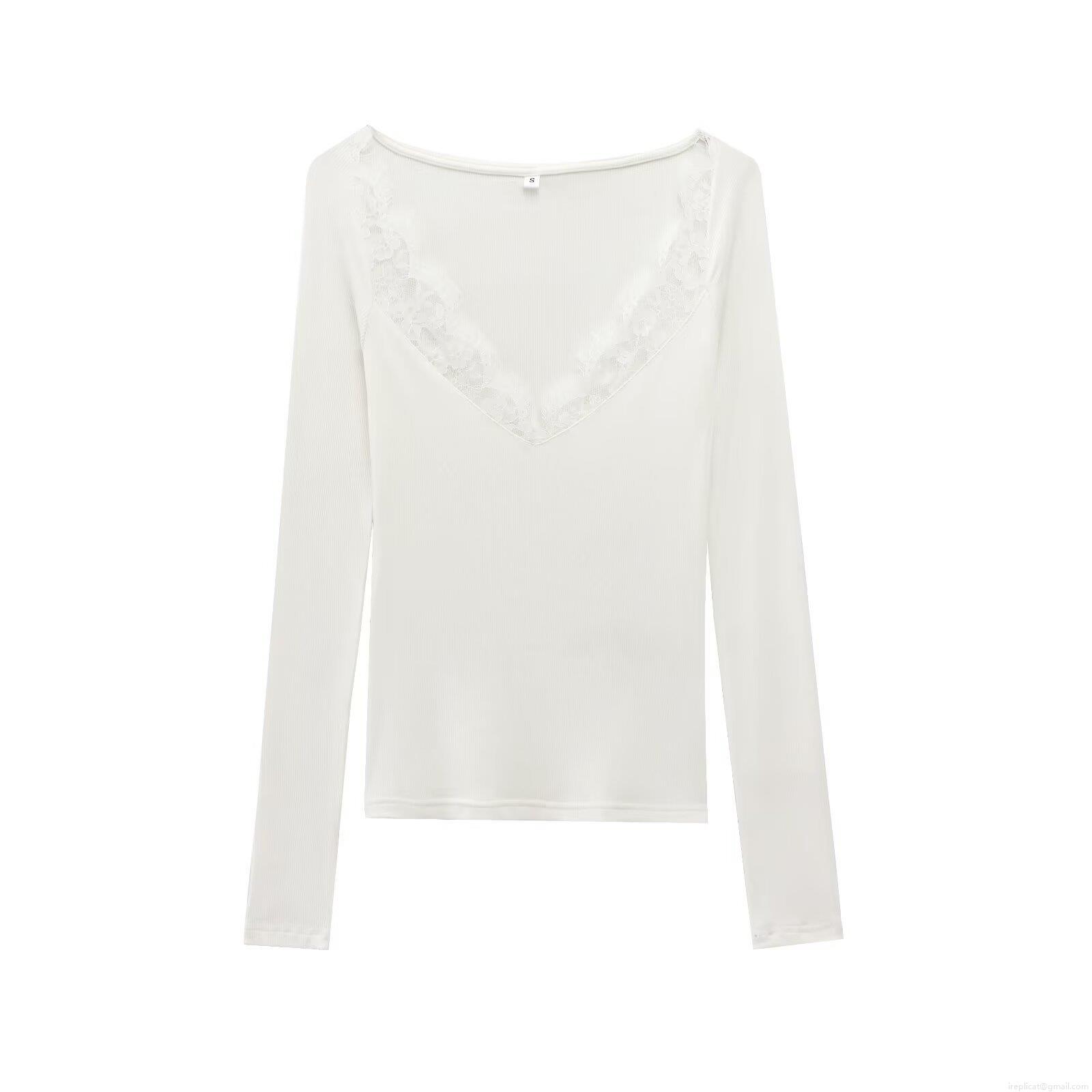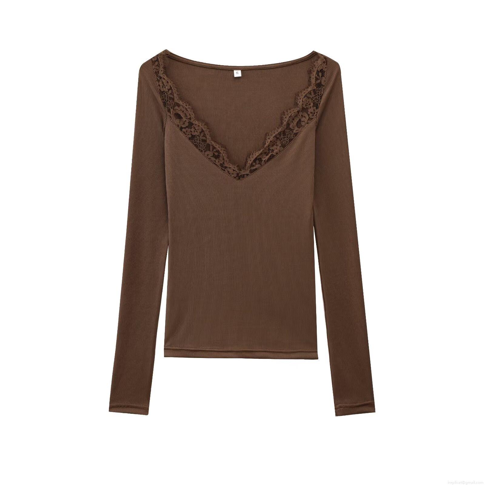 • Women's Sexy V Neck Lace Trim Ribbed Knit Long Sleeve T-Shirt Slim Fit Polyester Base Layer Top For Casual Daily Wear