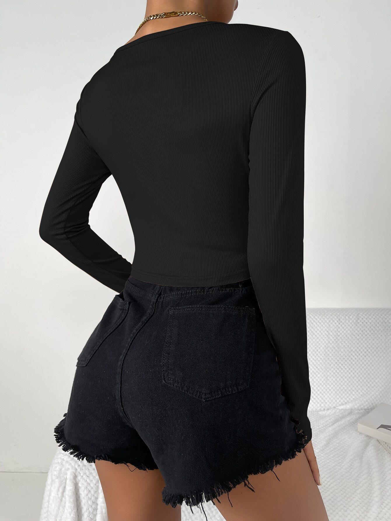 • Women's Sexy V Neck Long Sleeve T-Shirt Twist Front Rib Knit Crop Top Slim Fit Solid Color Casual Pullover Blouse For Autumn Winter