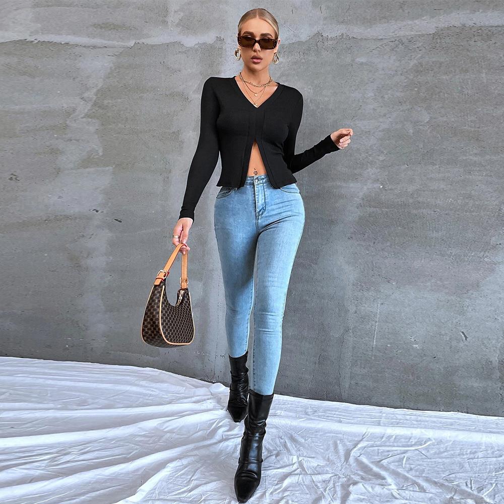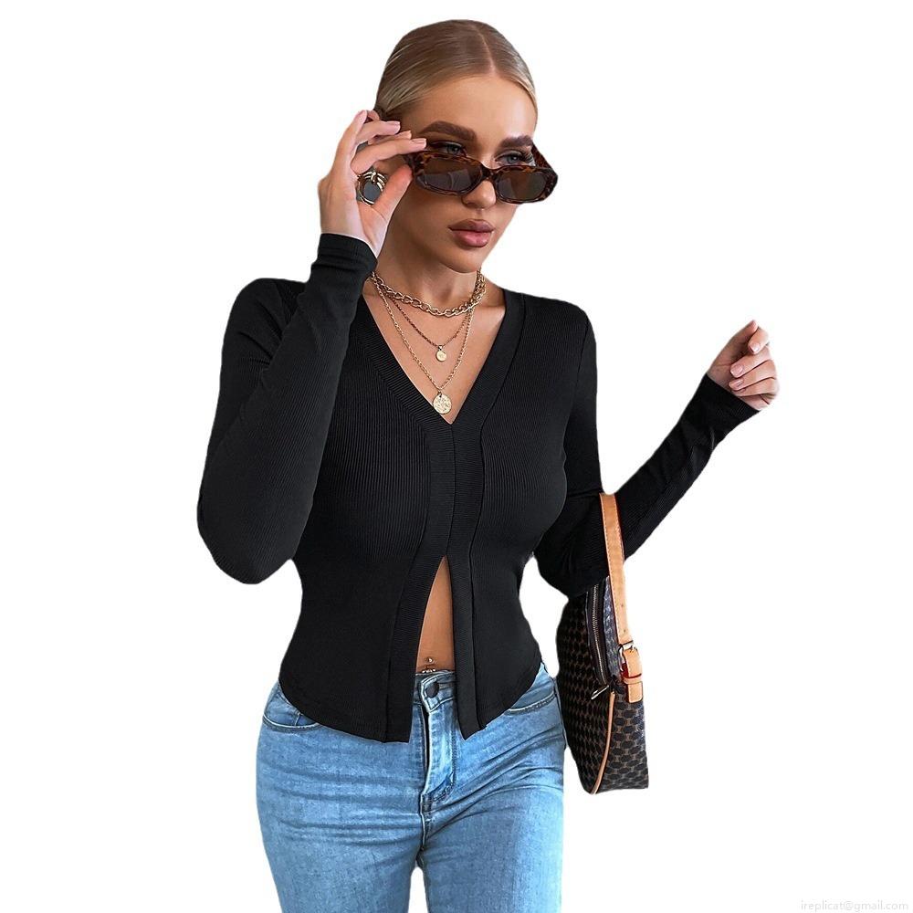 • Women's Sexy V Neck Ribbed Knit Long Sleeve T-Shirt Slim Fit Crop Top with Side Split Hem Elegant Commuter Solid Color Polyester Pullover Top for Ladies