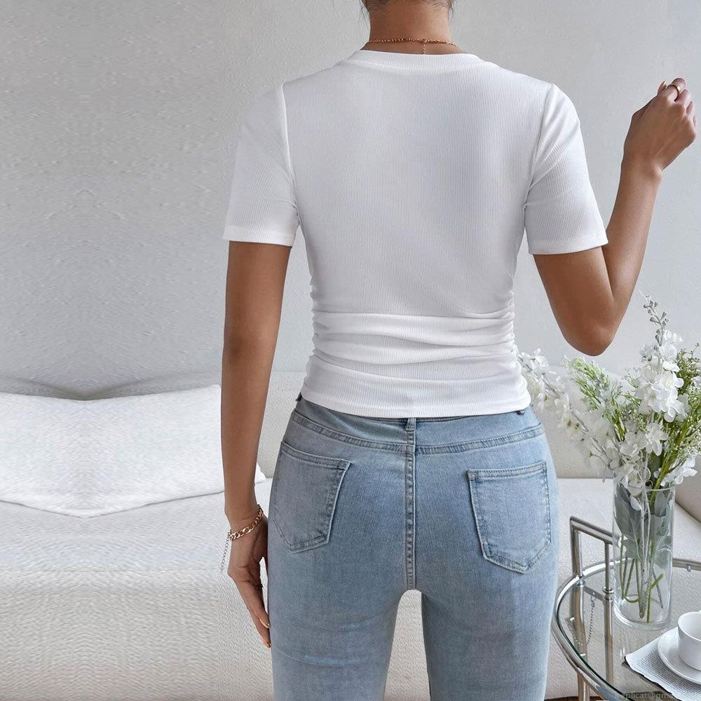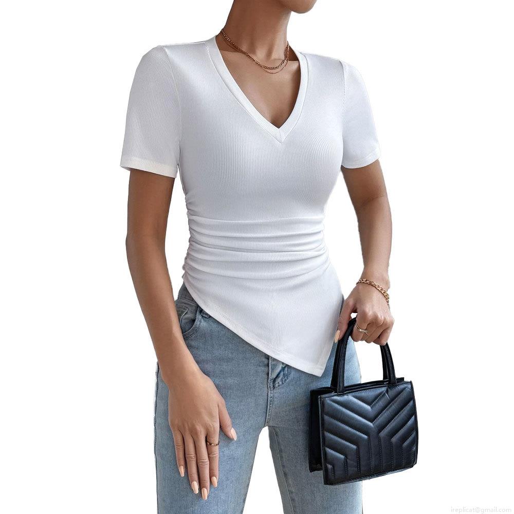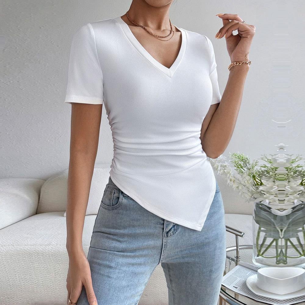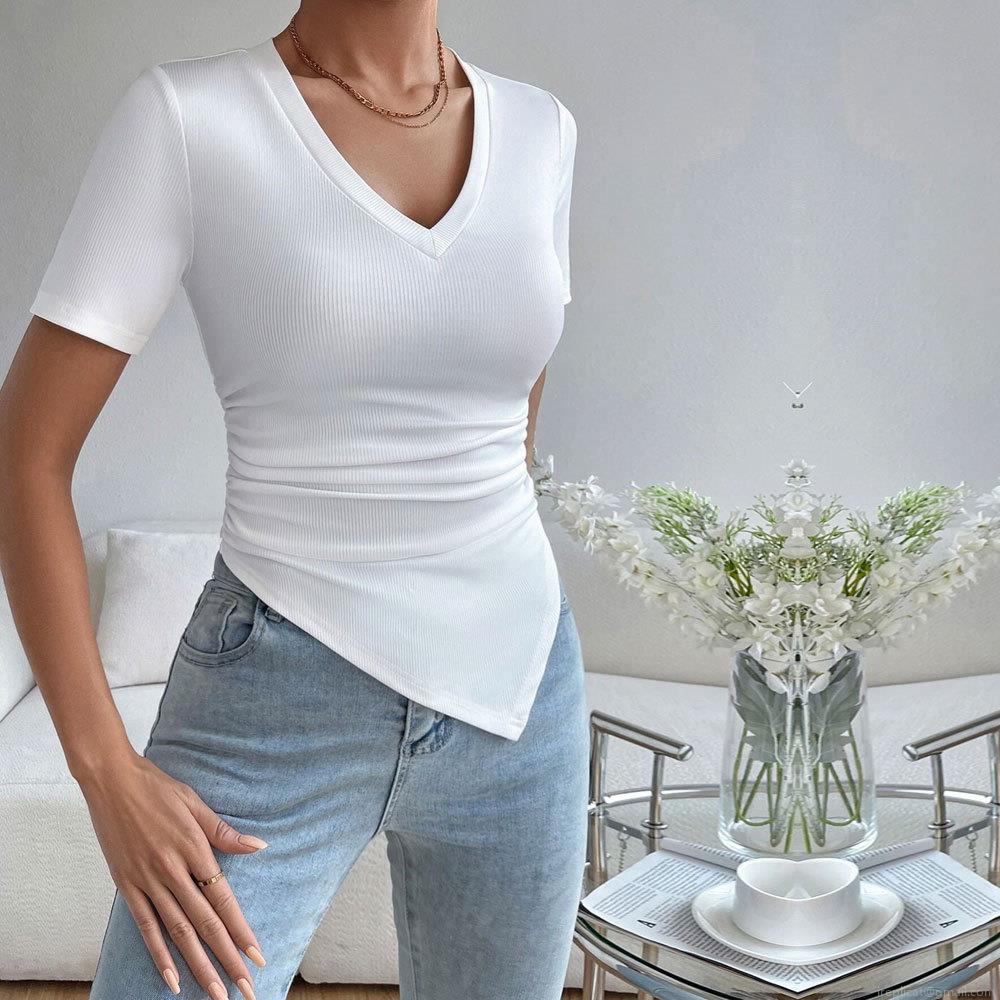 • Women's Sexy V Neck Ribbed Knit Short Sleeve T-Shirt Fashion Slim Fit Irregular Hem Solid Color Top For Casual Summer Daily Wear 95% Polyester 5% Elastane
