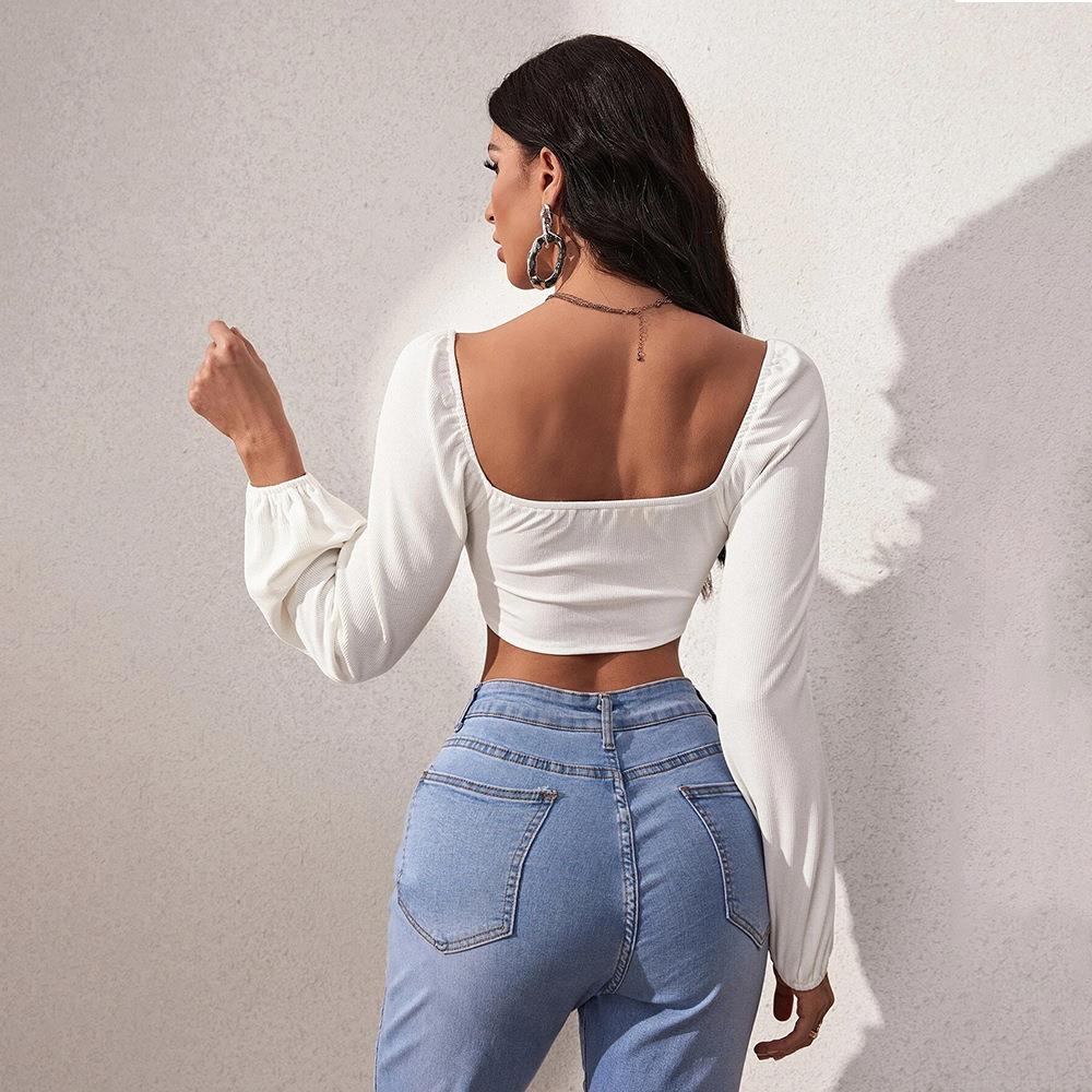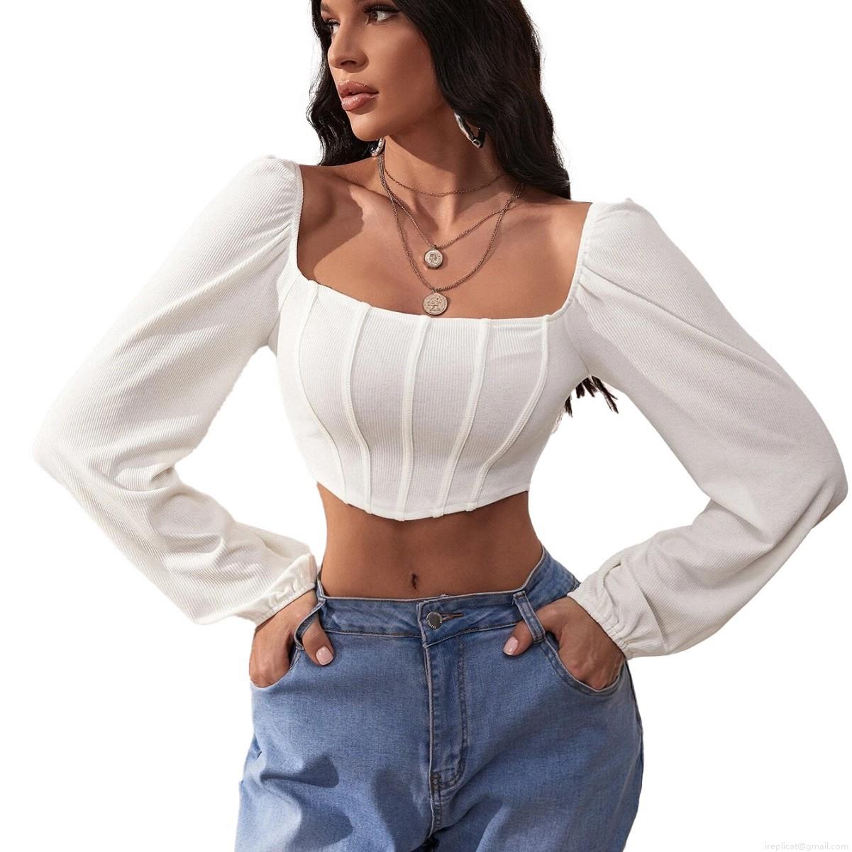 • Women's Sexy White Square Neck Long Sleeve Rayon Polyester Crop Top Corset Style Ribbed Knit T-Shirt Slim Fit Casual Fashion Spring Autumn Top