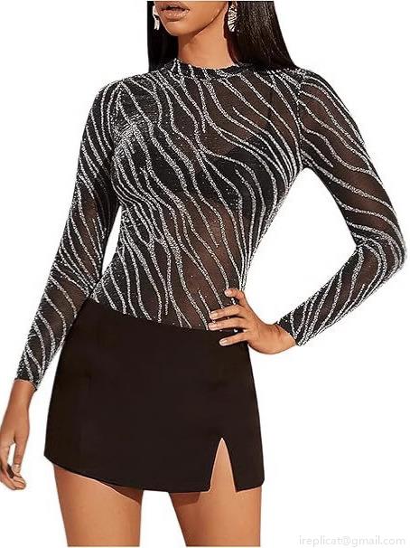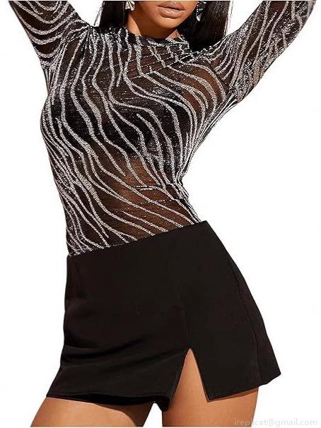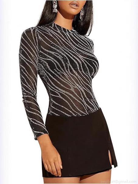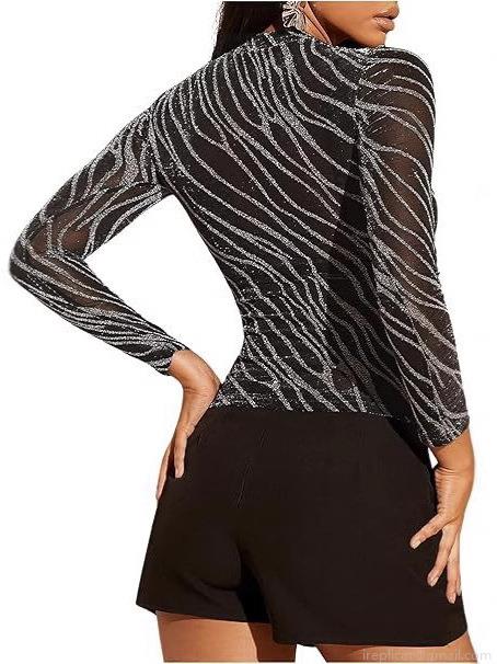 • Women's Sexy Zebra Print Mesh Top Sparkly Sequin Transparent Long Sleeve T-Shirt Slim Fit Clubwear Party Blouse For Night Out