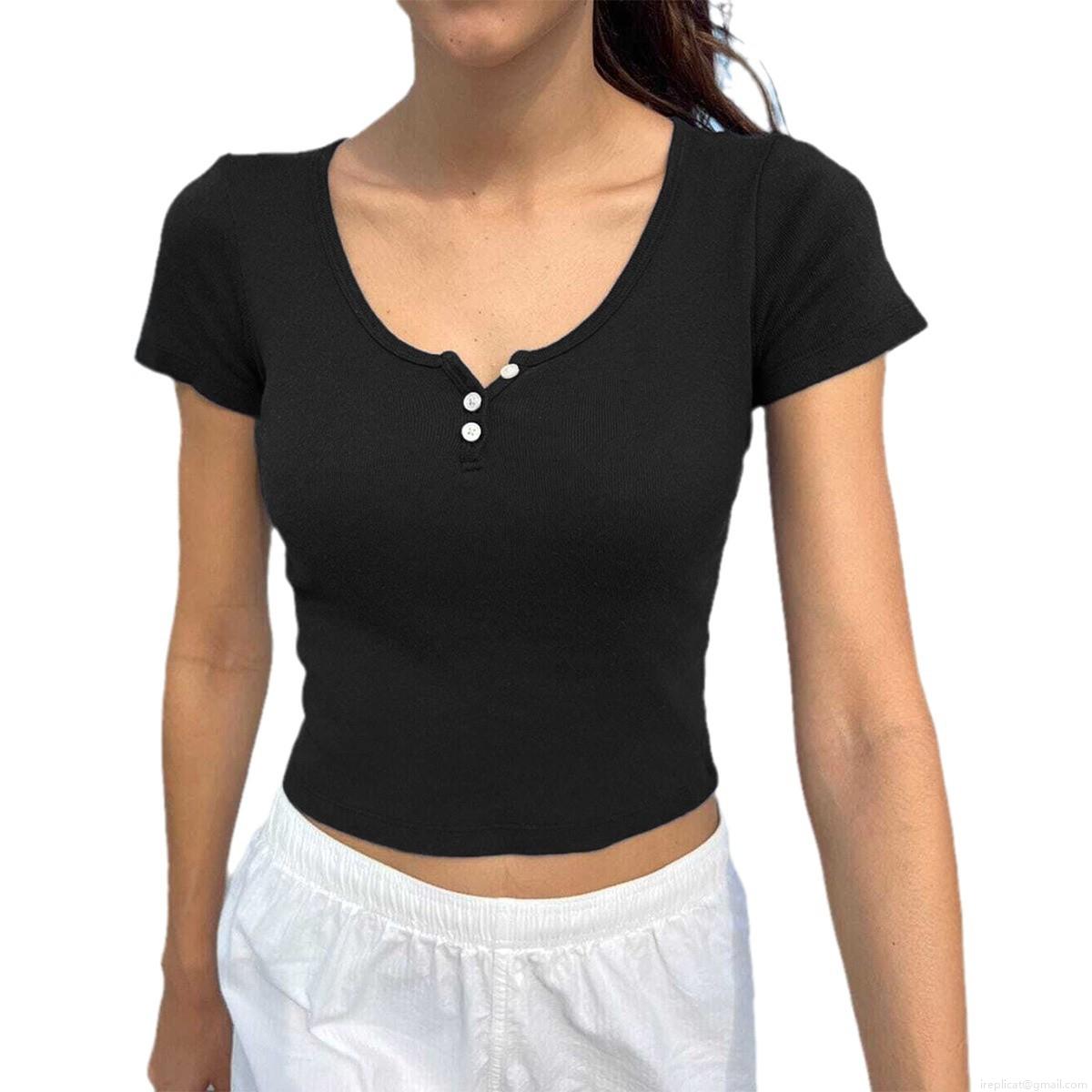 • Women's Short Sleeve Henley T-Shirt Ribbed Knit Slim Fit V-Neck Button Front Cropped Top Casual Summer Beach Resort Apparel