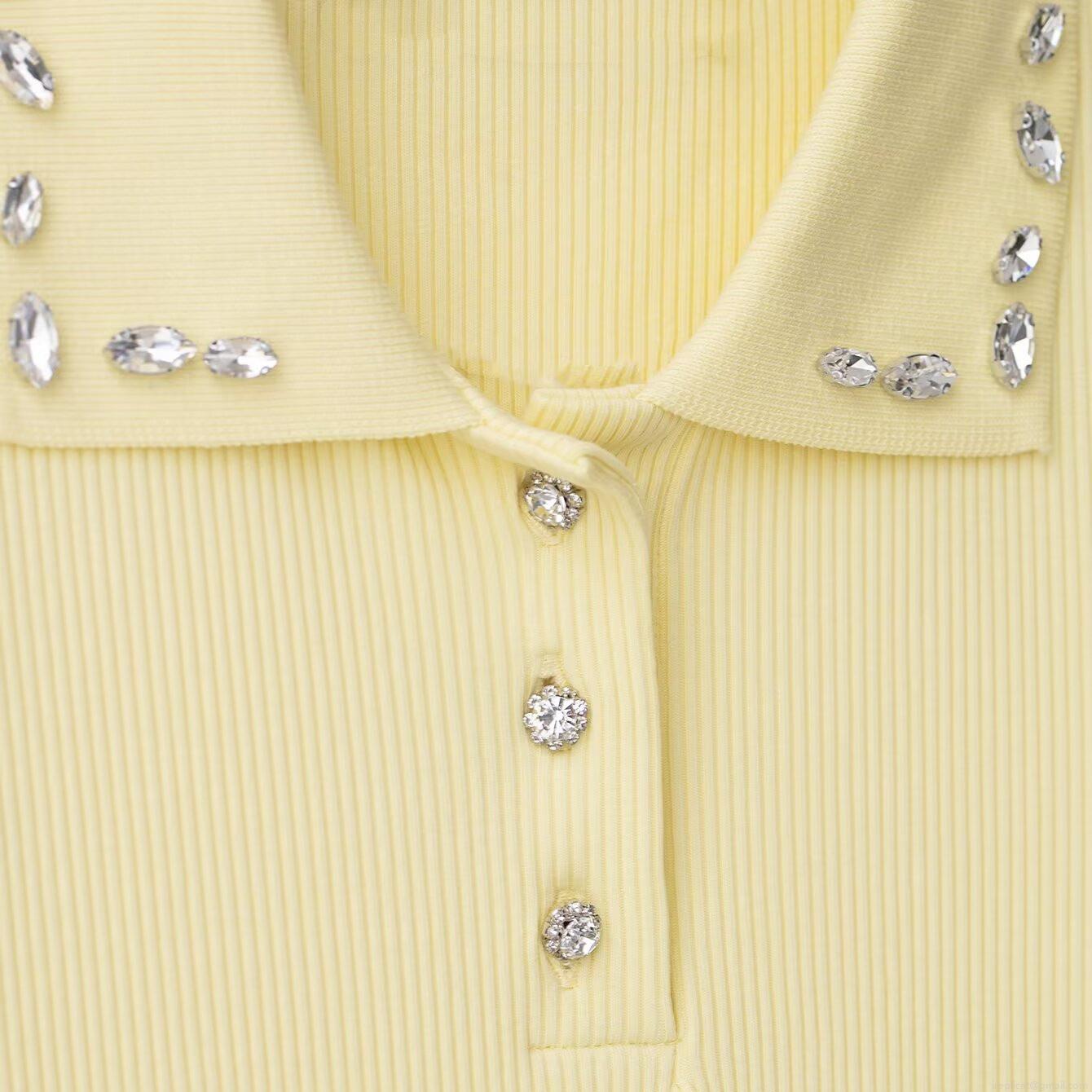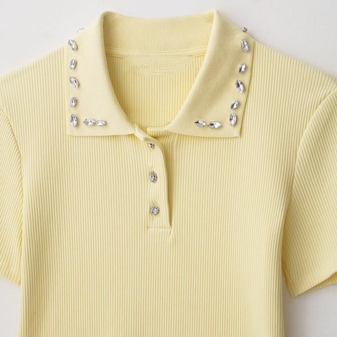 Solid Color, Polo Collar, Rhinestone Decoration, Ribbed Texture