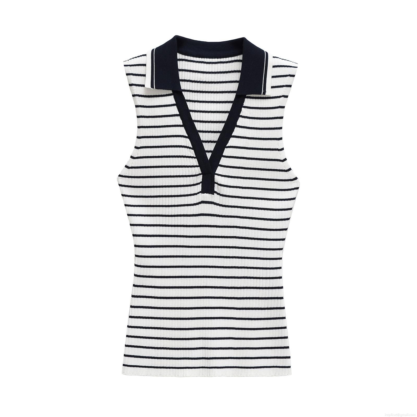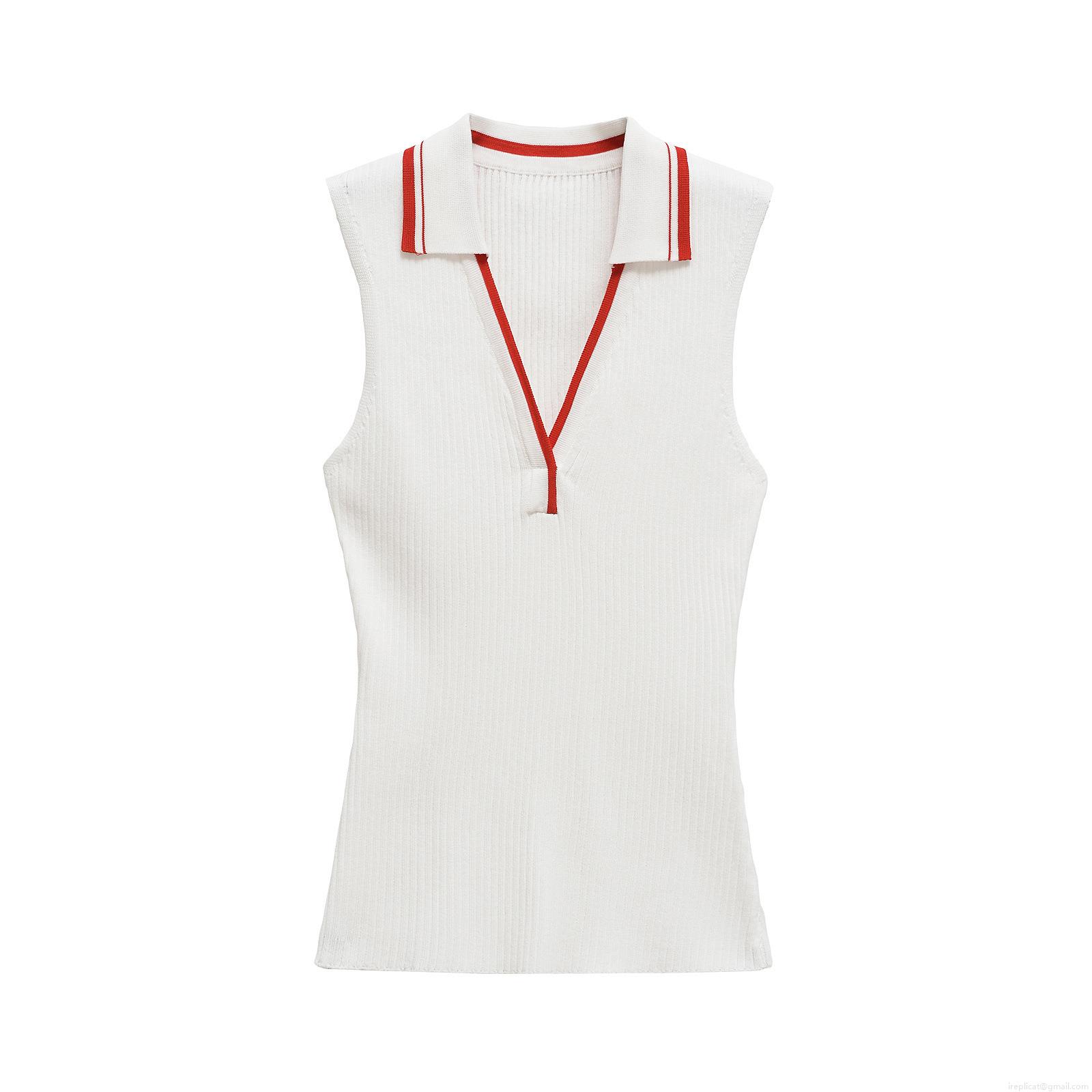 • Women's Sleeveless Knit Polo Shirt Contrast Striped V-Neck Ribbed Mercerized Cotton Tank Top Casual Streetwear Summer Slim Fit Pullover Tee