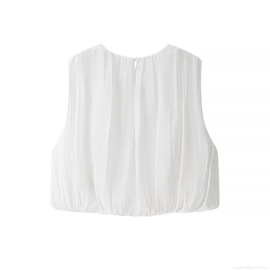 • Women's Sleeveless T-Shirt Pleated Round Neck Bubble Hem Polyester Crop Top For Summer Streetwear Party Solid Color Lightweight Casual Blouse