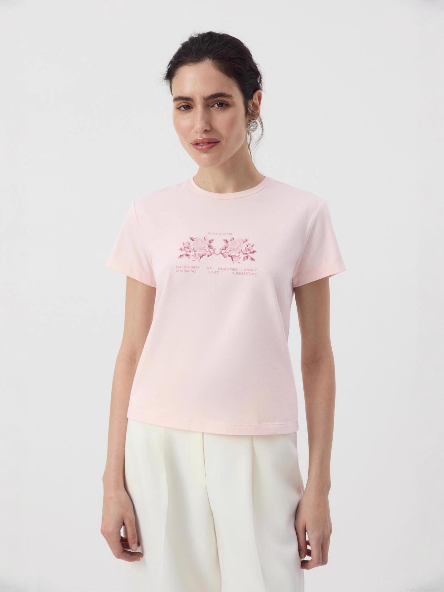 Women's Slim Fit Cotton T-Shirt Rose Flower Embroidery Letter Print Short Sleeve Casual Round Neck Top For Summer