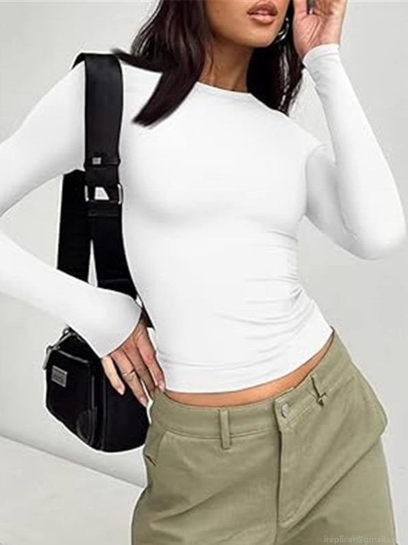 • Women's Slim Fit Cropped T-Shirt Long Sleeve Solid Color Round Neck Ruched Polyester Base Layer Top for Daily Casual Commuting