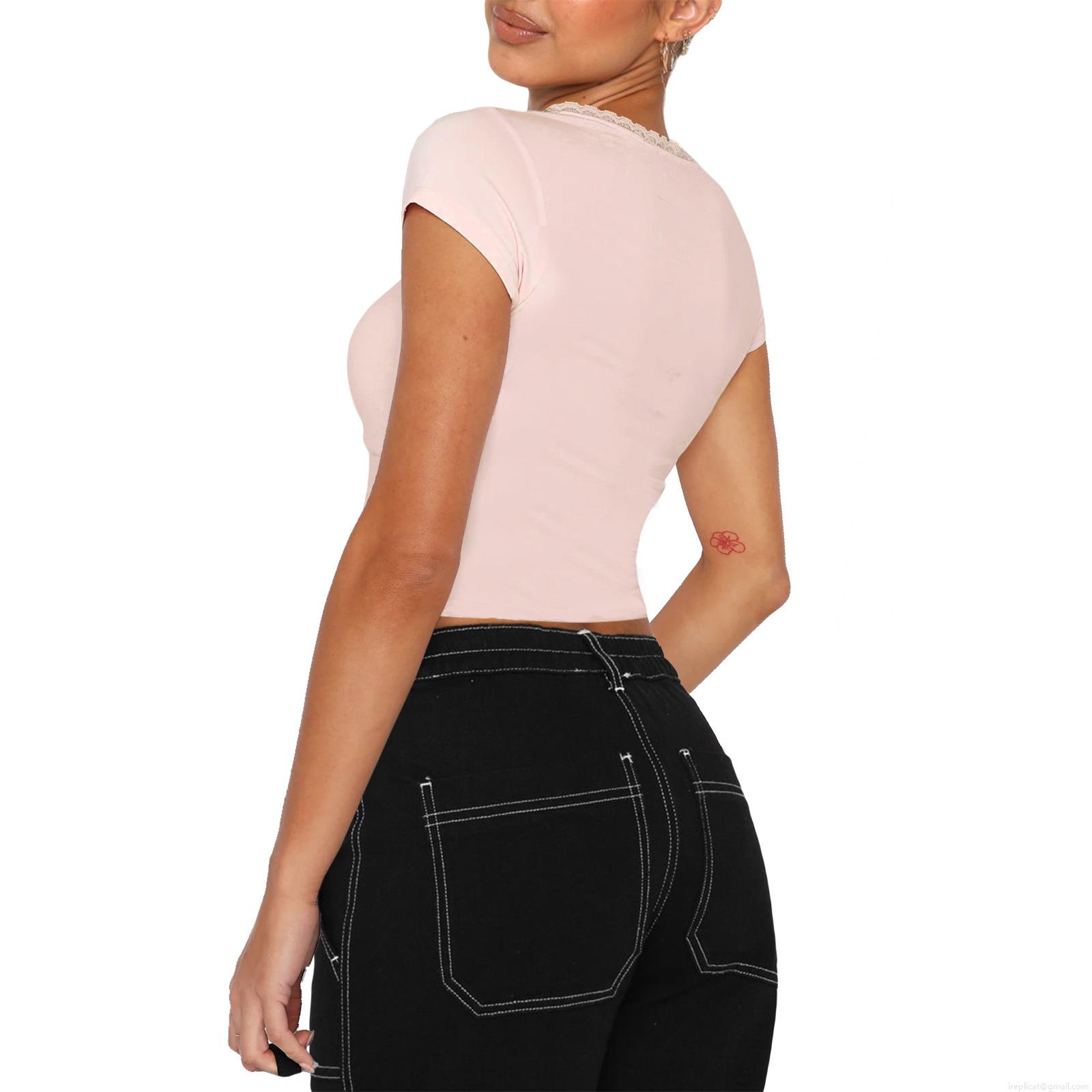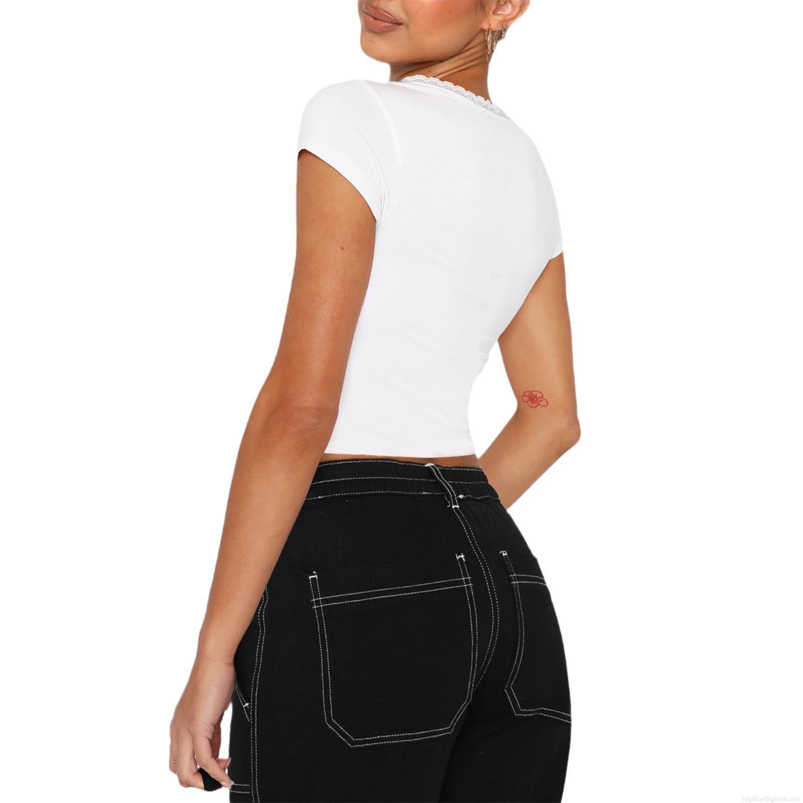 • Women's Slim Fit Cropped T-Shirt Square Neck Lace Trim Bow Detail Short Sleeve Ribbed Top Sexy Solid Color Casual Summer Streetwear Tee for Women