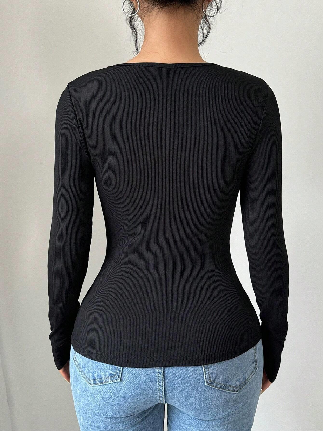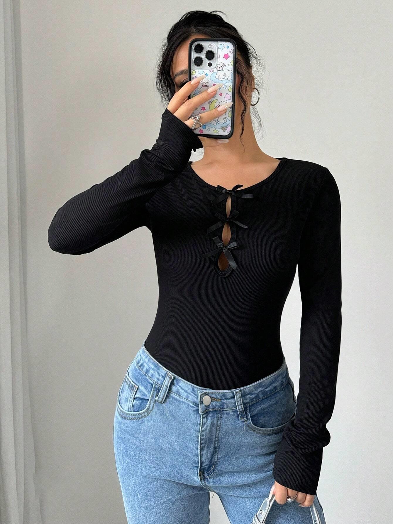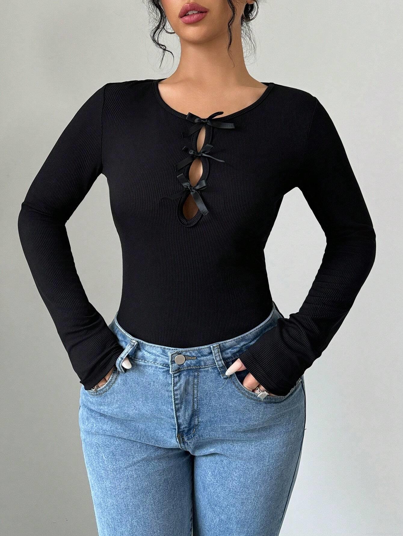 • Women's Slim Fit Rib Knit Long Sleeve T-Shirt With Bowknot Cut Out Detail Pullover Casual Polyester Blend Fall Winter Top
