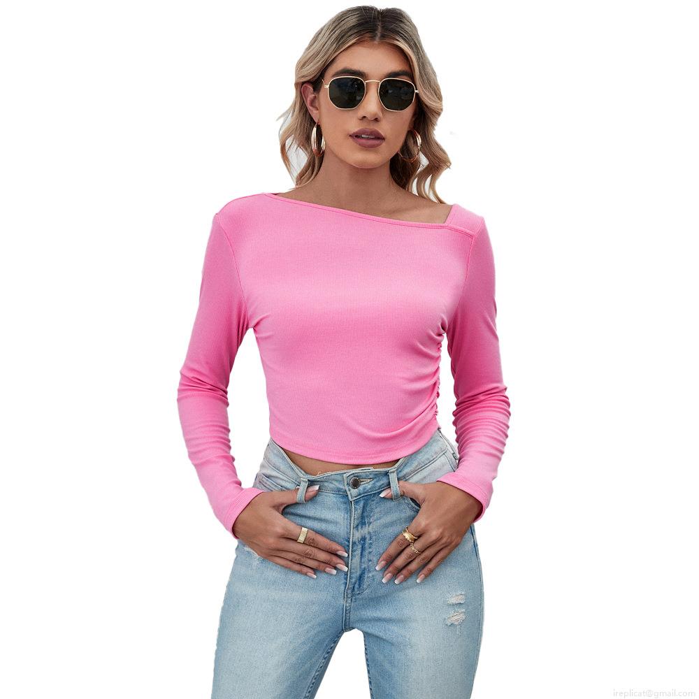 • Women's Slim Fit Ribbed Knit Crop Top Long Sleeve Asymmetric Neck Ruched Side T-Shirt Rayon Blend Solid Color Basic Tee For Streetwear Clubwear Party