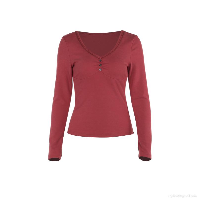 • Women's Slim Fit Ribbed Knit Long Sleeve T-Shirt Polyester Spandex V-Neck Lace Trim Decorative Buttons Basic Casual Elegant Top For Women Daily Wear