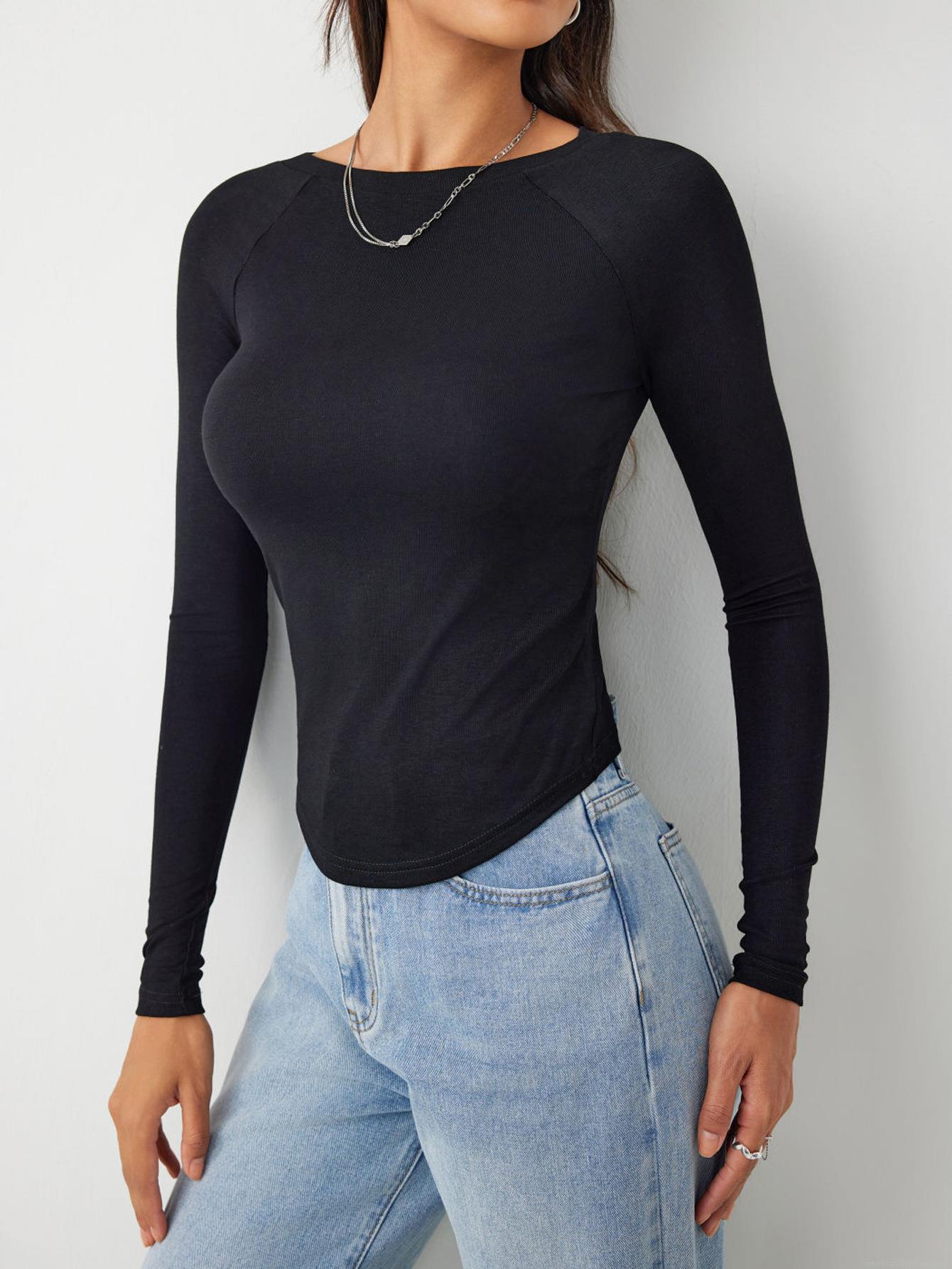 • Women's Slim Fit Ribbed Knit Long Sleeve T-Shirt Viscose Blend Round Neck Curved Hem Solid Basic Casual Pullover Top Autumn Winter Clothing