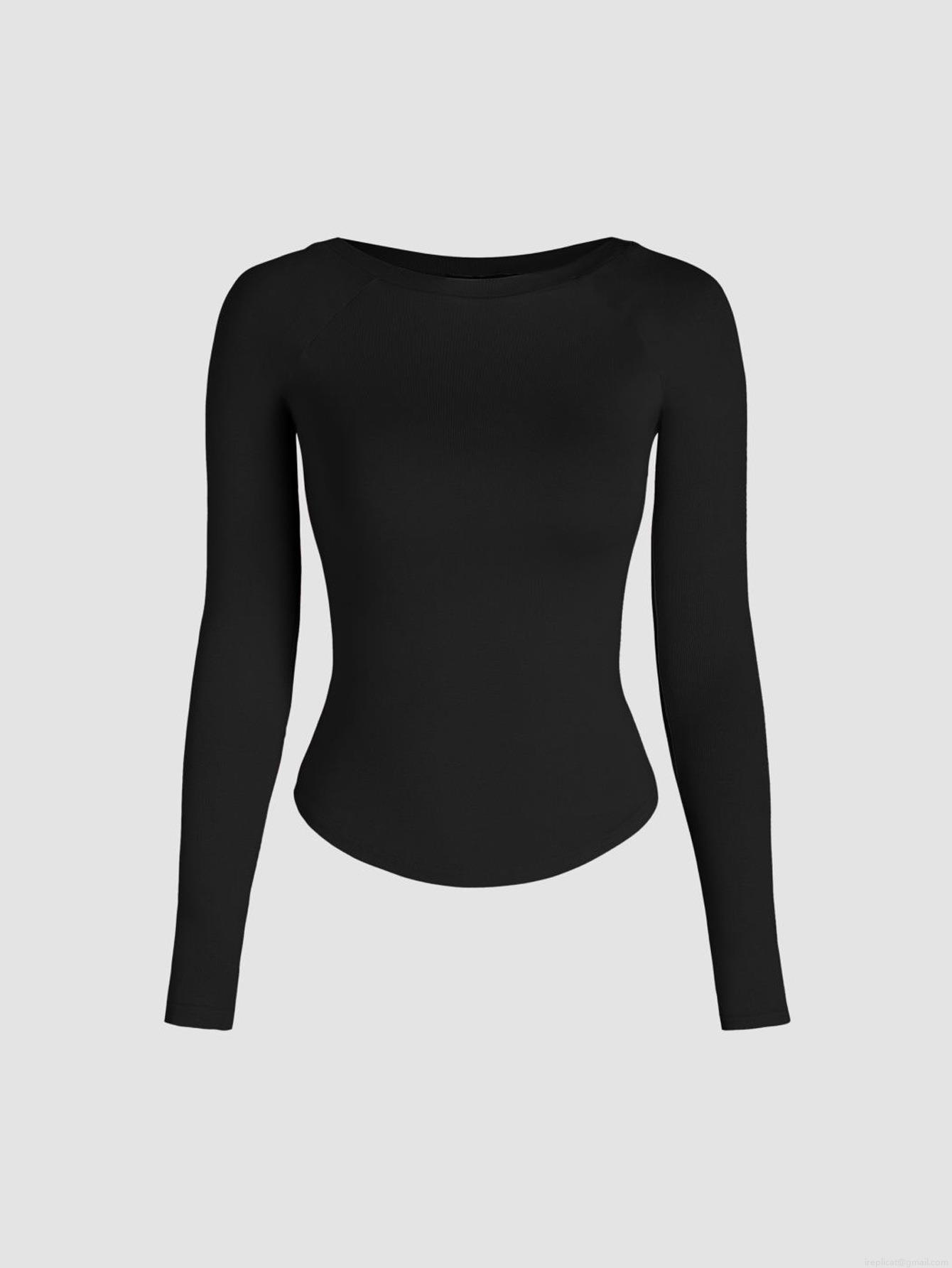 Women's Slim Fit Ribbed Knit Long Sleeve T-Shirt Viscose Blend Round Neck Curved Hem Solid Basic Casual Pullover Top Autumn Winter Clothing