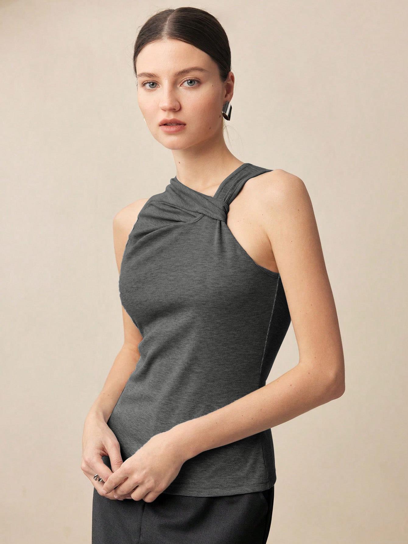 Women's Slim Fit Ribbed Knit Sleeveless T-Shirt Twisted Asymmetrical Neck Solid Color Summer Tank Top Sexy Intellectual Style Elegant Commute Vest