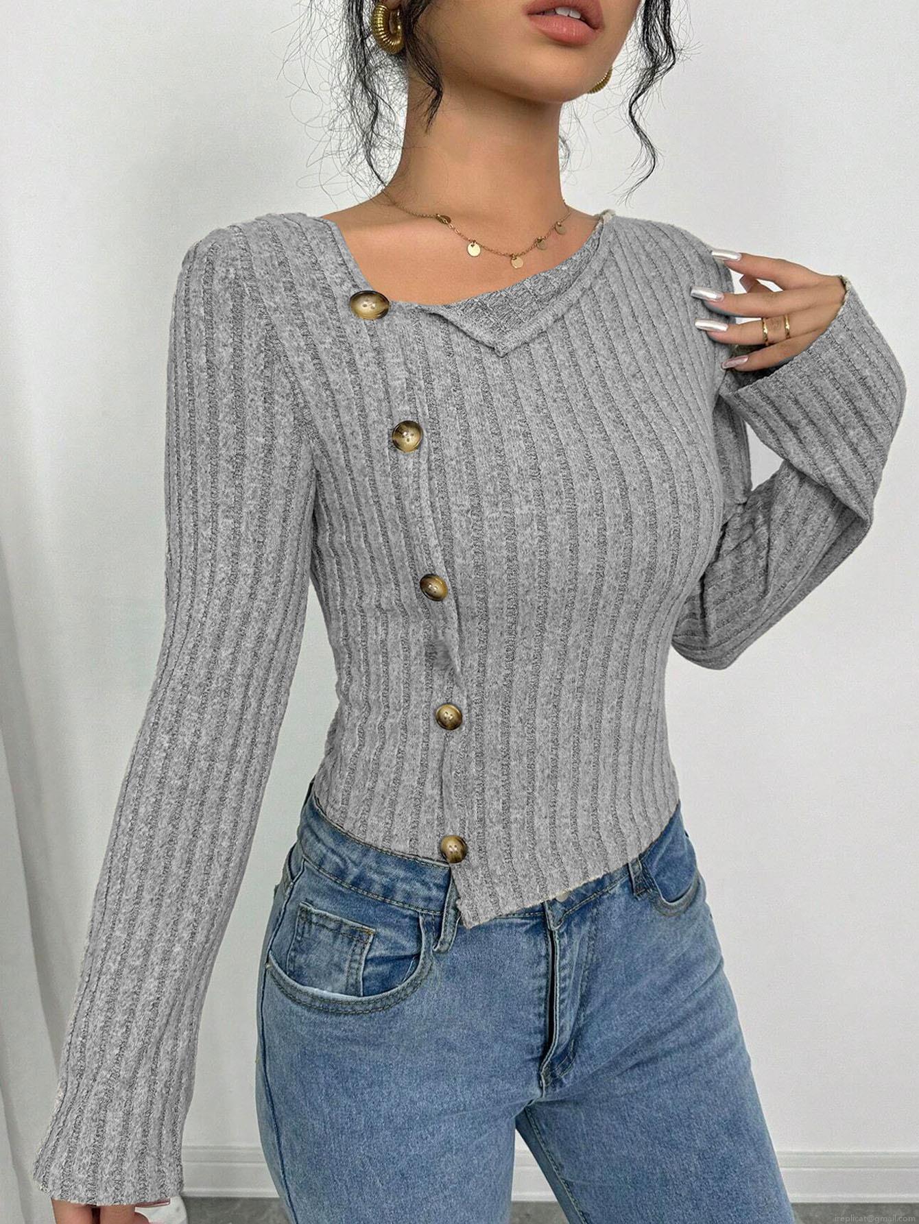 • Women's Slim Fit Ribbed Knit T-Shirt Elegant Long Sleeve Crop Top With Decorative Buttons Asymmetrical Neckline Intellectual Style Pullover Tops
