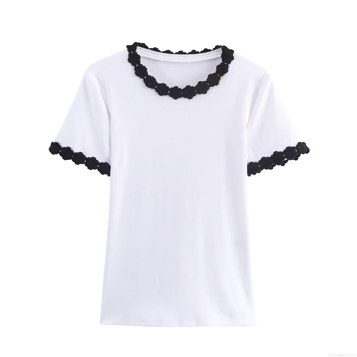 • Women's Slim Fit Rib-Knit T-Shirt Featuring 3D Floral Lace Trim Round Neck Short Sleeve Basic Tee Casual Streetwear Summer Tops For Women