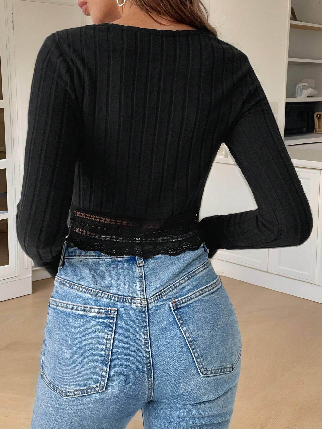 • Women's Slim Fit Rib-Knit T-Shirt Long Sleeve Cropped Top With Lace Patchwork Hem Minimalist Solid Color Casual Shirt For Women
