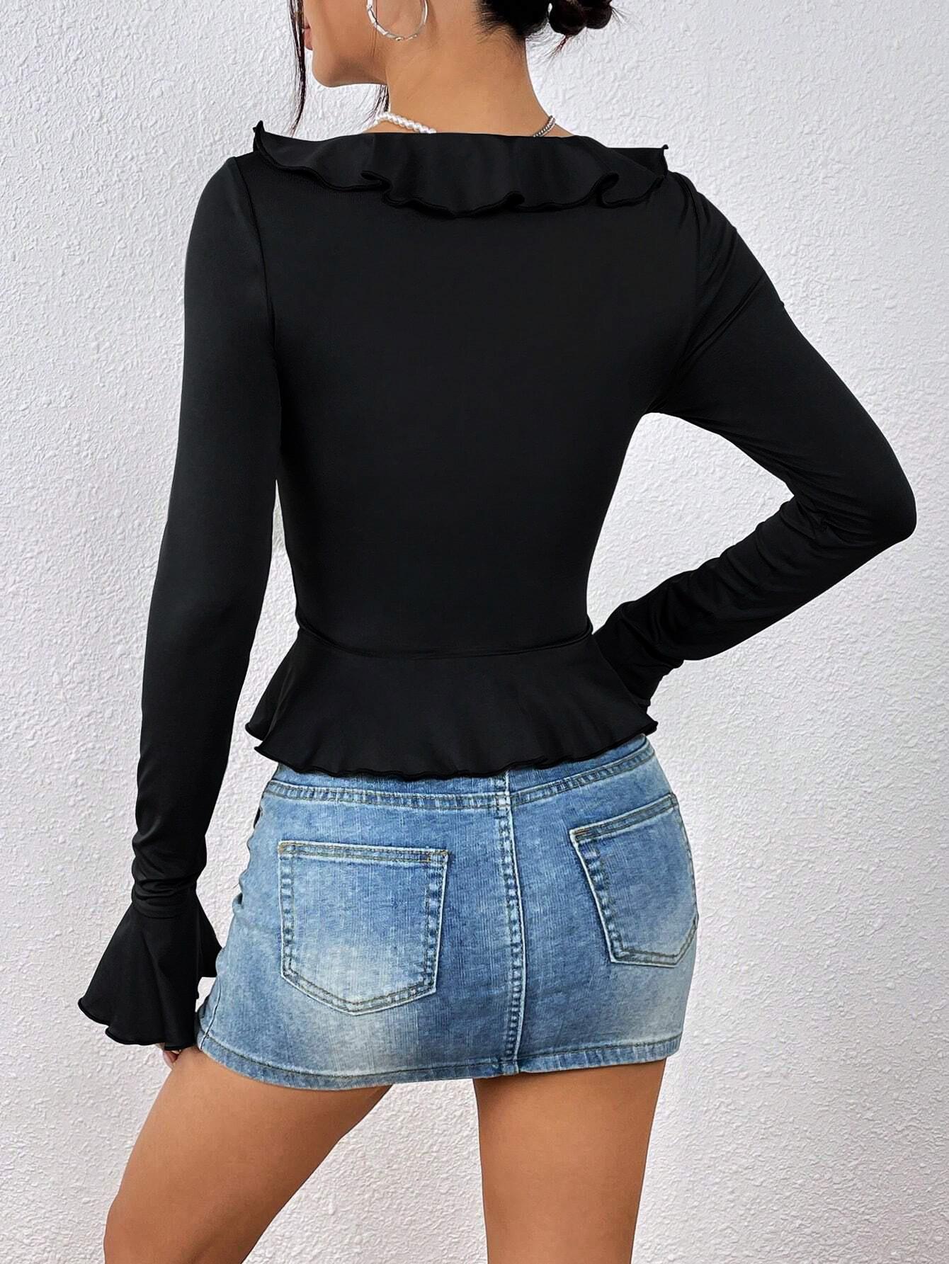 Women's Slim Fit Ruffle V-Neck Long Sleeve T-Shirt Viscose Elastane Blend Bell Sleeve Cropped Top Y2K Style Casual Solid Color Streetwear Tee
