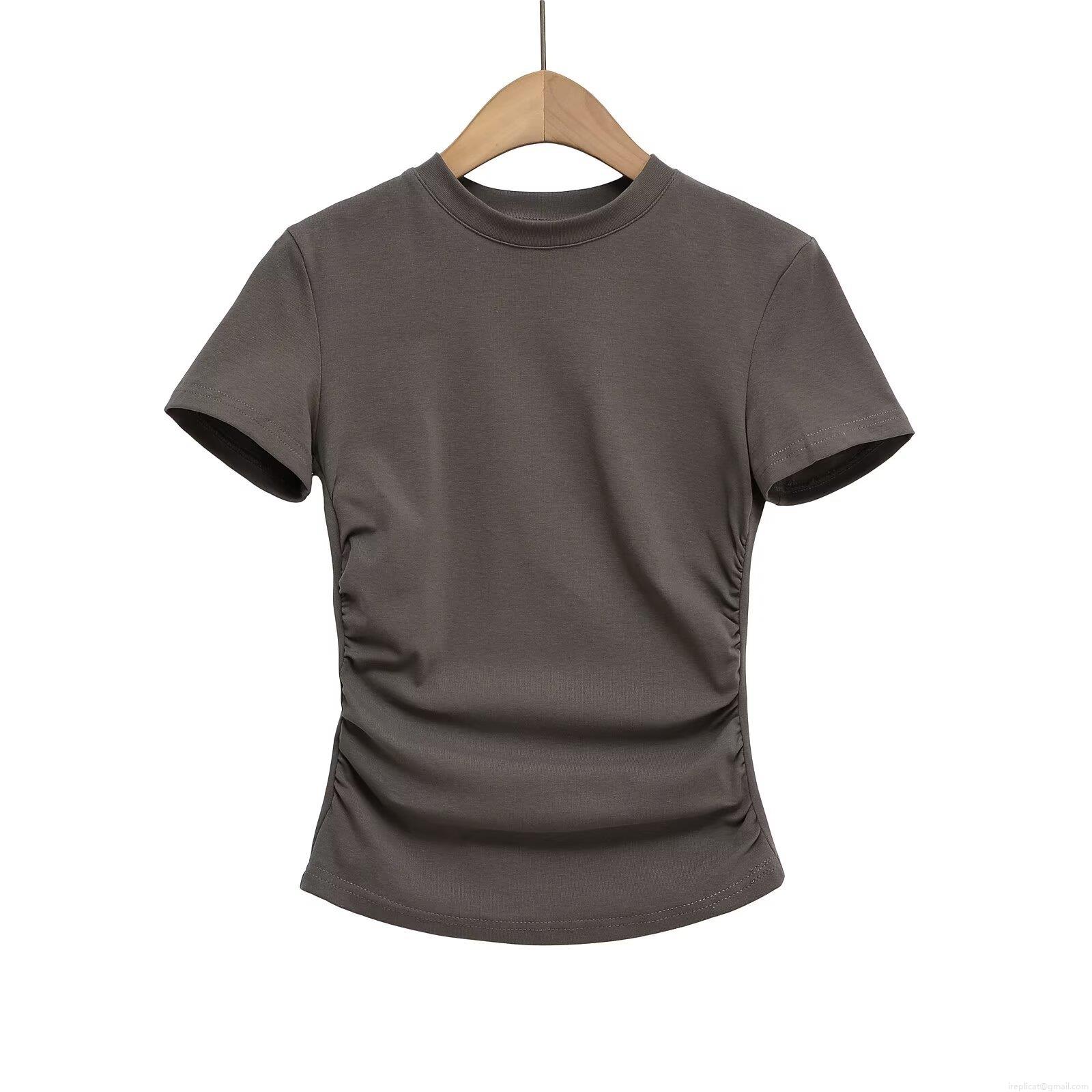 Women's Slim Fit Short Sleeve T-Shirt Ruched Side Solid Color Round Neck Pullover Top Elastic Polyester Casual Tee Streetwear For Women