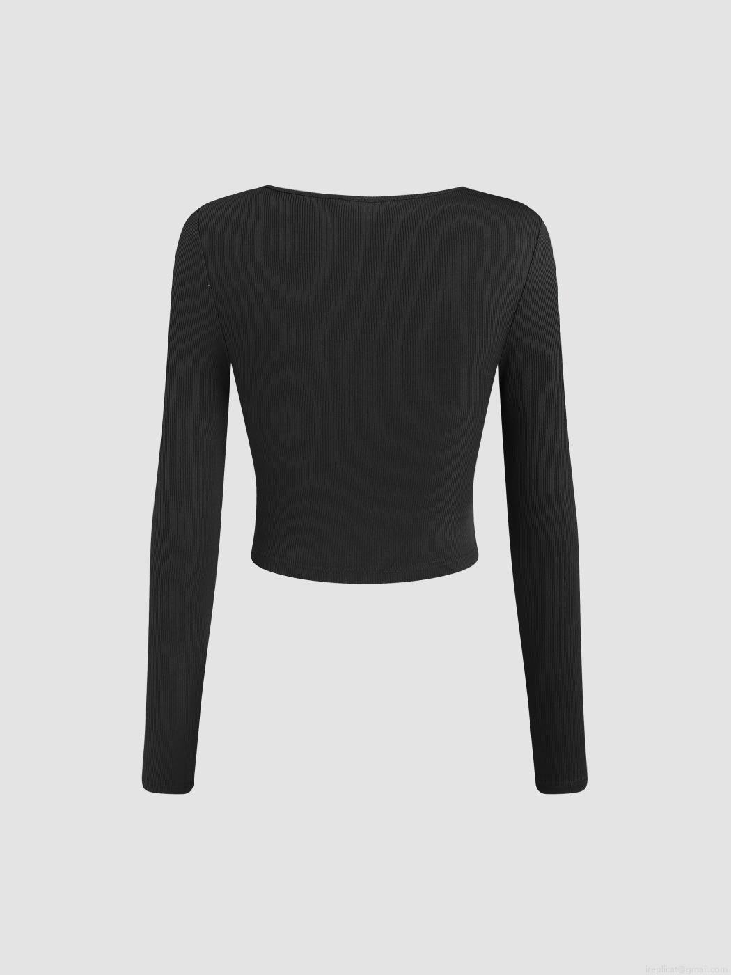 • Women's Slim Fit Square Neck Long Sleeve Ribbed Knit T-Shirt With Ruched Front 95% Polyester 5% Elastane Basic Casual Solid Color Cropped Top Tee