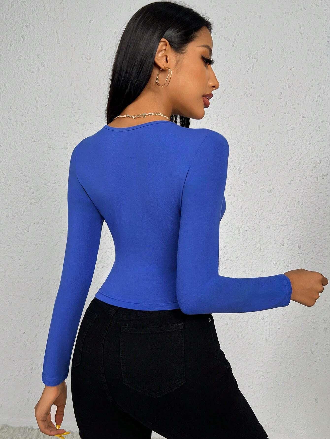 • Women's Slim Fit Square Neck Long Sleeve T-Shirt Ruched Drawstring Front Cotton Blend Solid Color Crop Top Casual Fashion Daily Base Layer Blouse