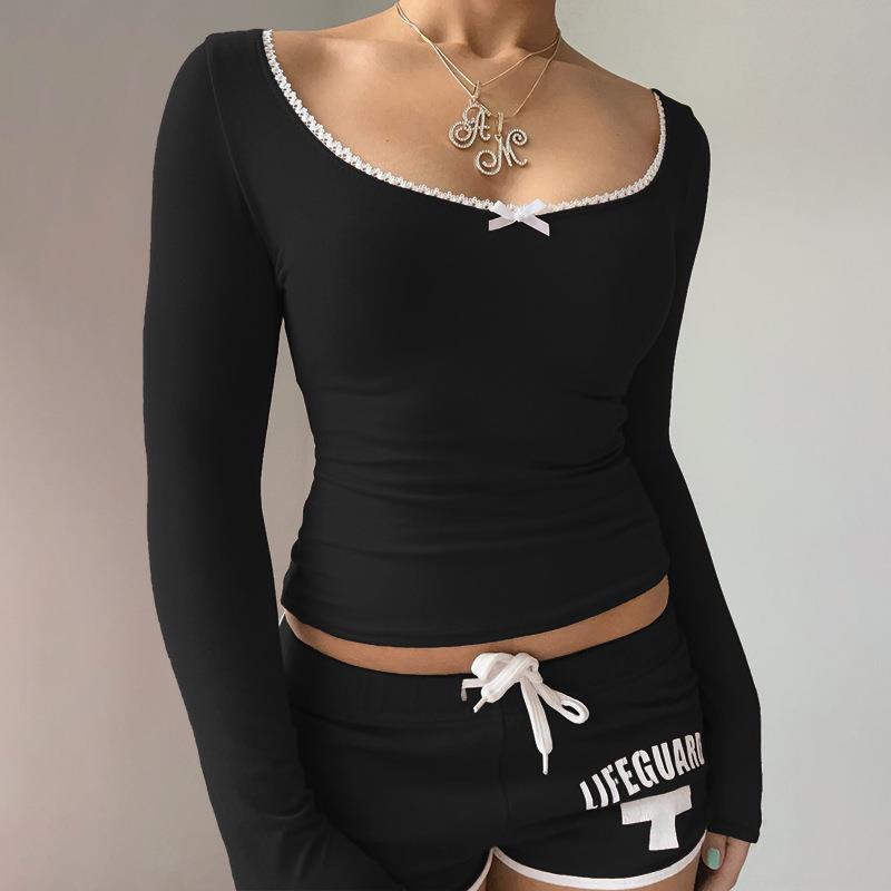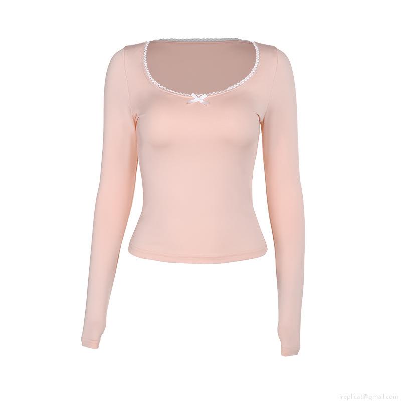 • Women's Slim Fit Square Neck Long Sleeve T-Shirt With White Lace Trim And Bow Detail Solid Color Polyester Spandex Casual Ribbed Top