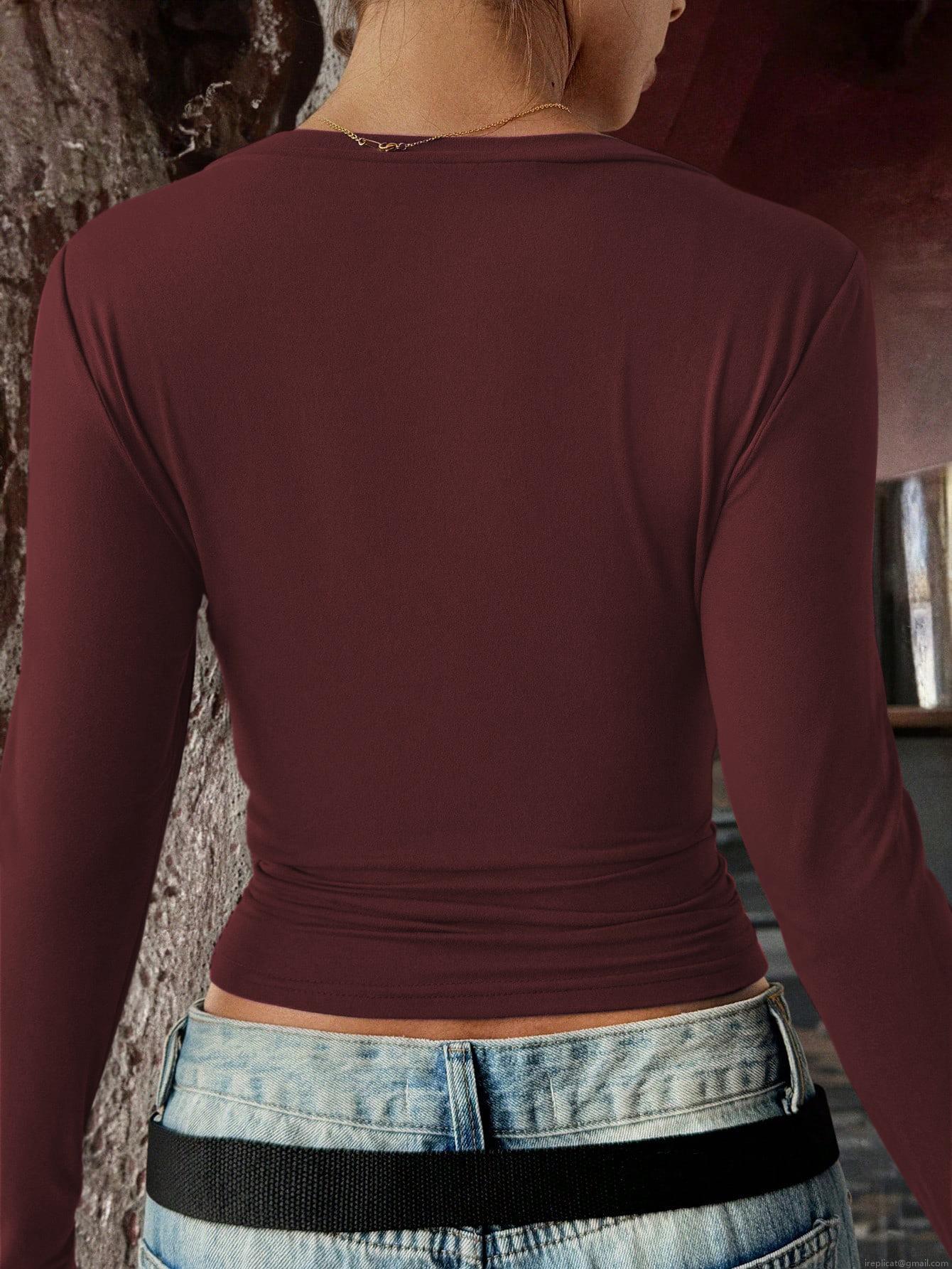 • Women's Slim Fit V-Neck Long Sleeve T-Shirt Burgundy Milk Silk Stretch Cropped Top Sexy Retro Basic Tee For Autumn Winter Casual Daily Wear