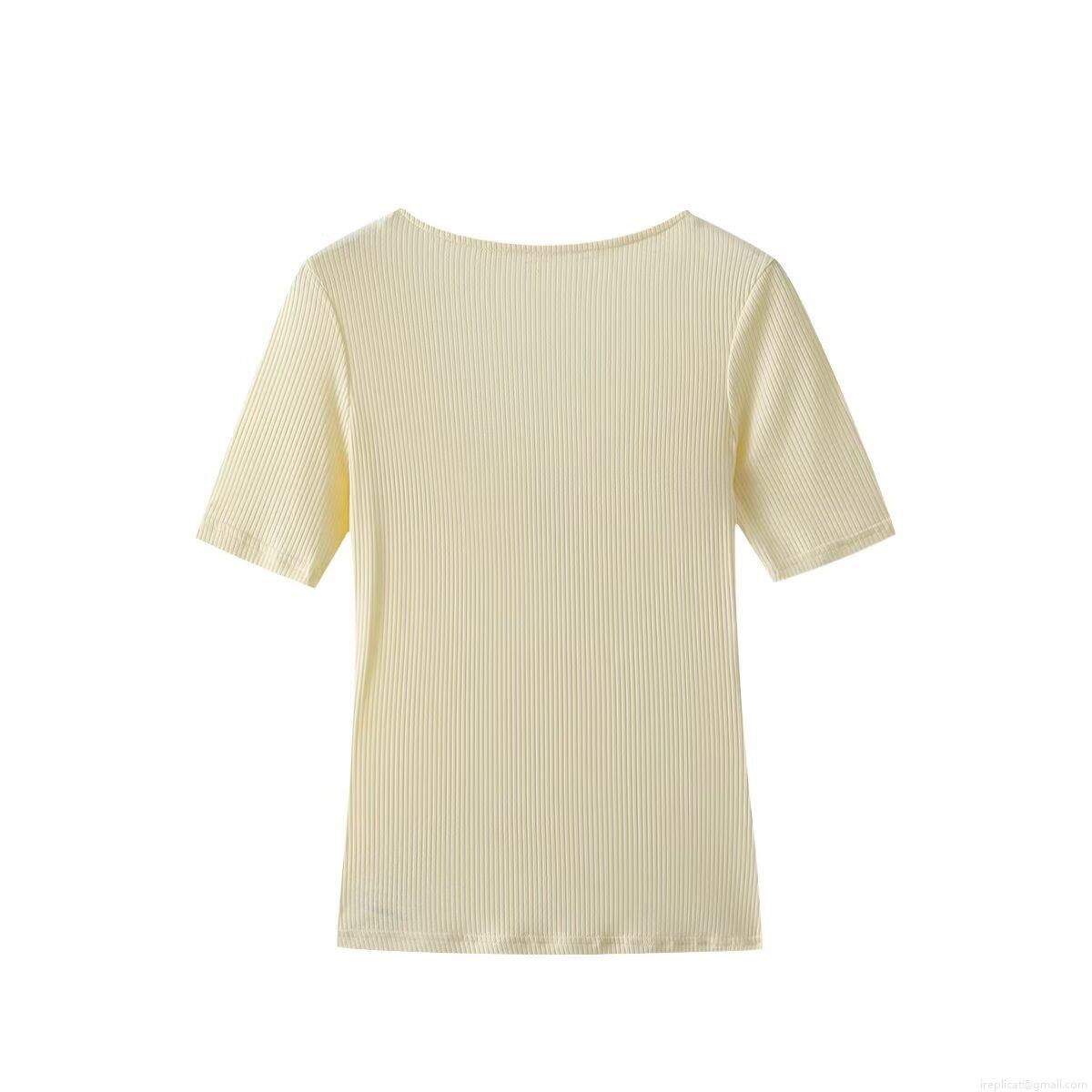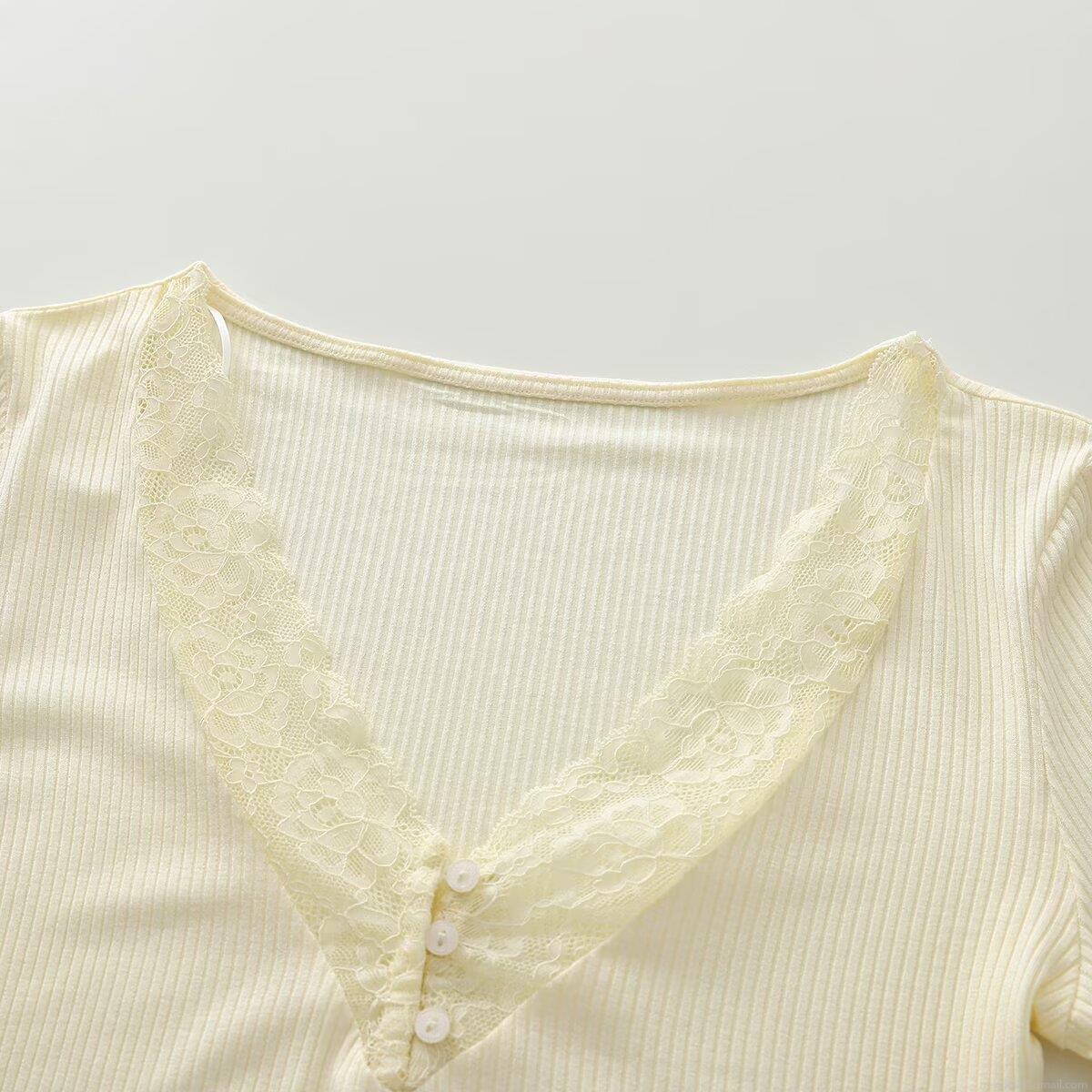 Women's Slim Fit V-Neck T-Shirt Lace Trim Cotton Blend Ribbed Knit Short Sleeve Button Decor Sweet Elegant Casual Tops For Ladies