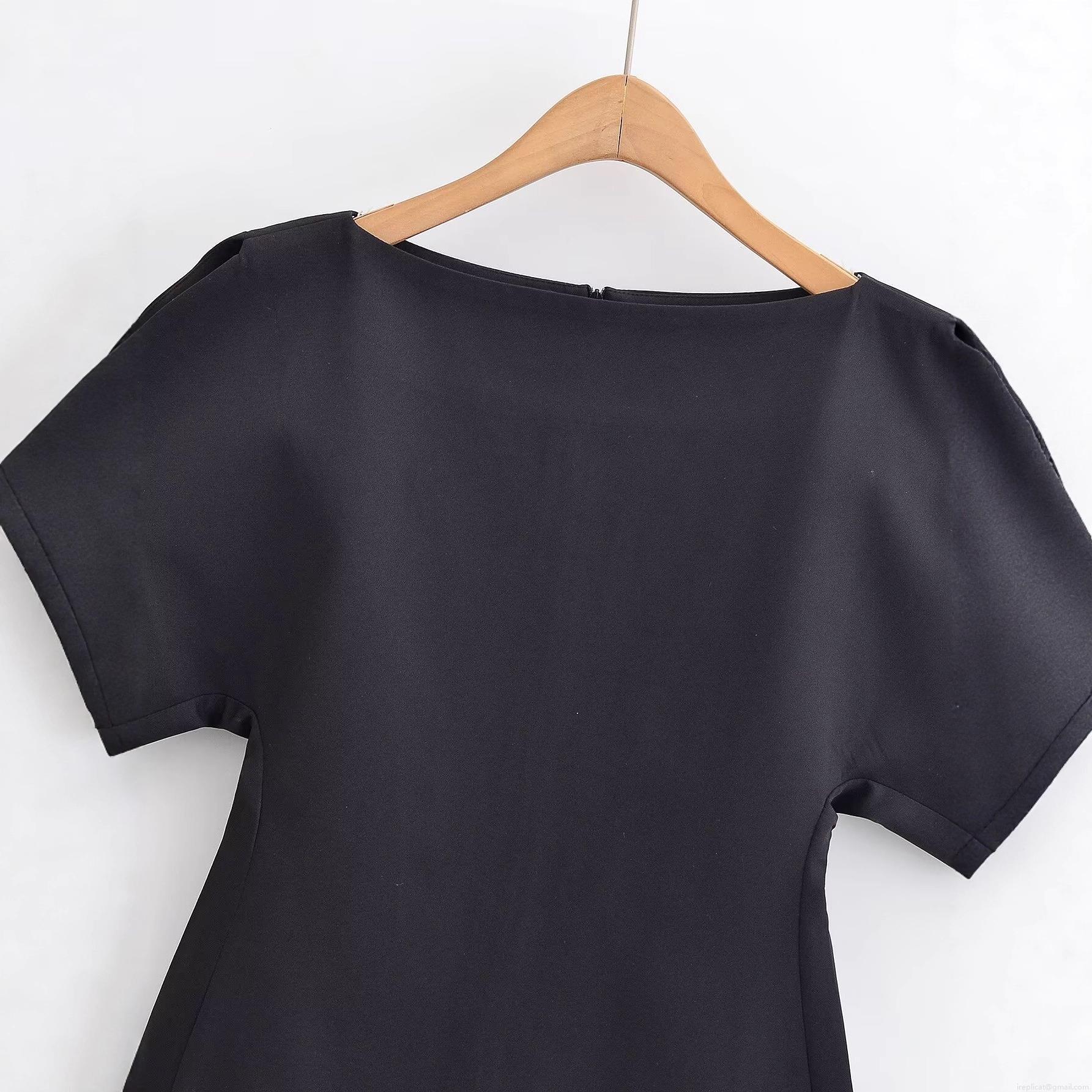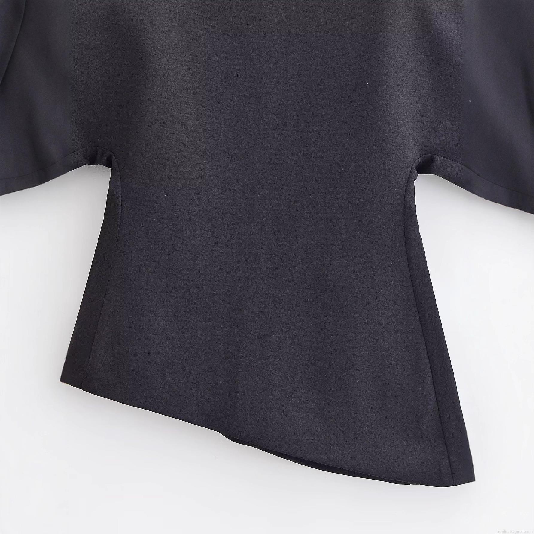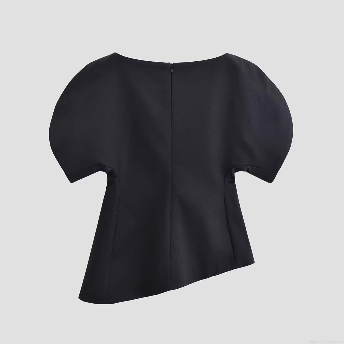 • Women's Solid Black Polyester T-Shirt With Puff Sleeves And Asymmetrical Hem Chic Boat Neck Back Zipper Top For Street Style Women Casual Top