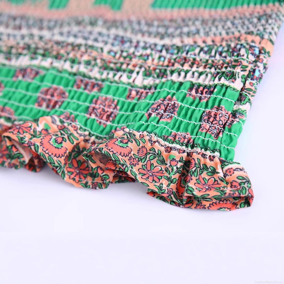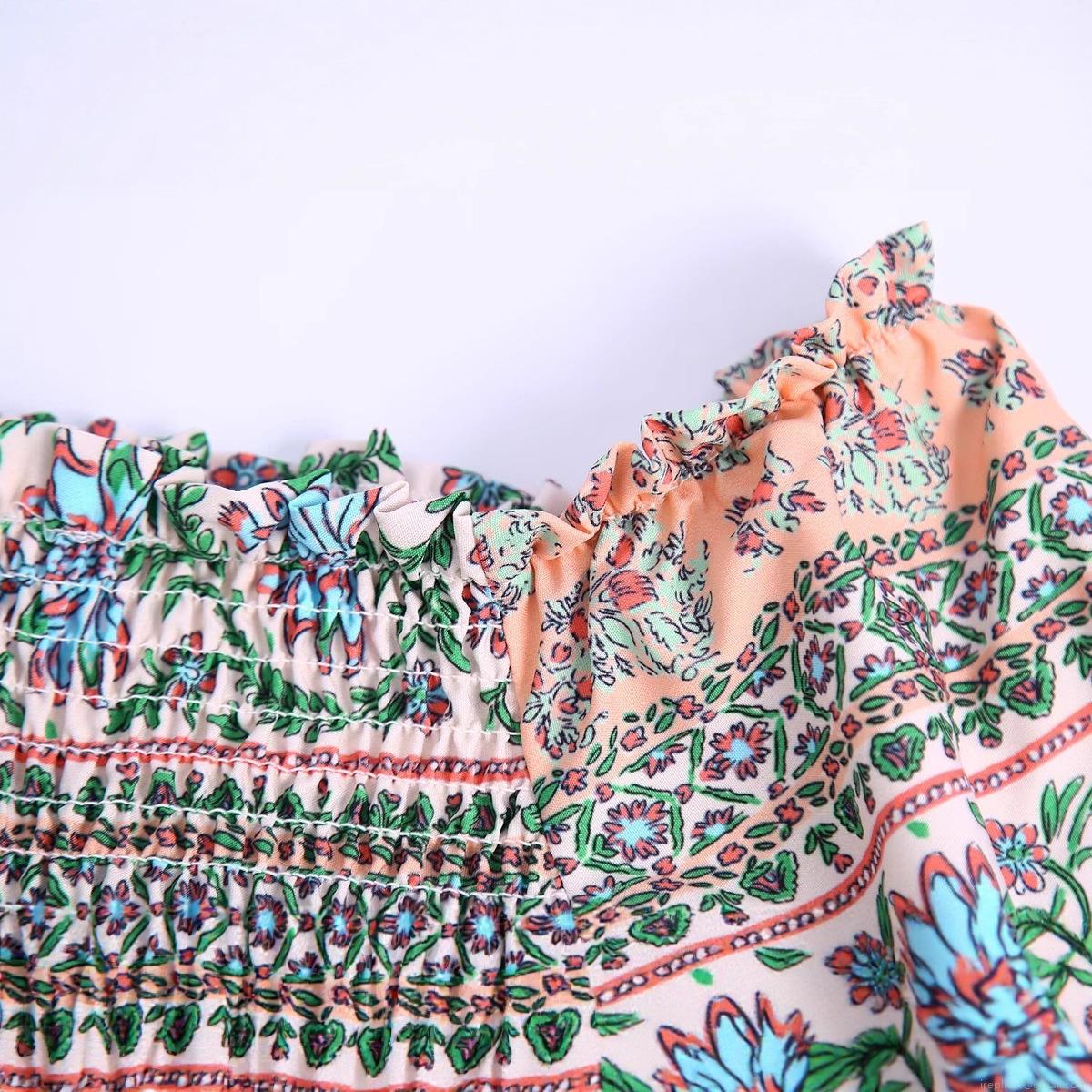 Floral Pattern, Ruffles, Printing, Slab, Square Collar, Paisley Pattern, Elastic Pleats