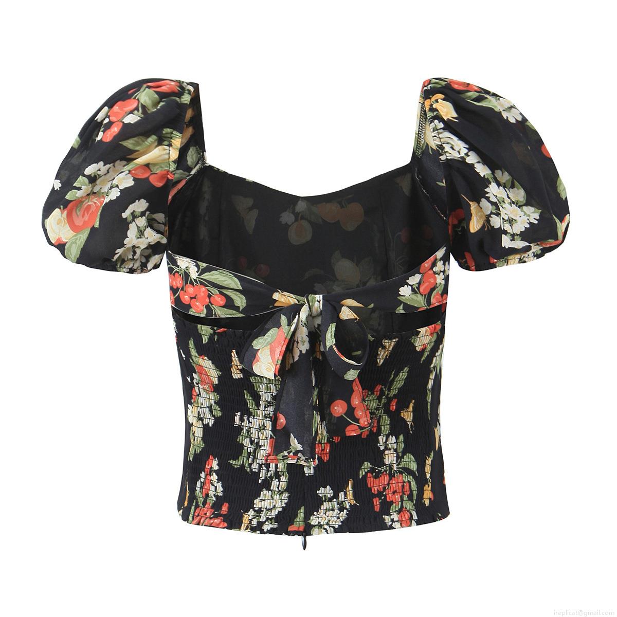 • Women's Square Neck Puff Sleeve T-Shirt Backless Lace Up Cherry Floral Print Polyester Summer Slim Fit Crop Top Street Style Fashion Tee