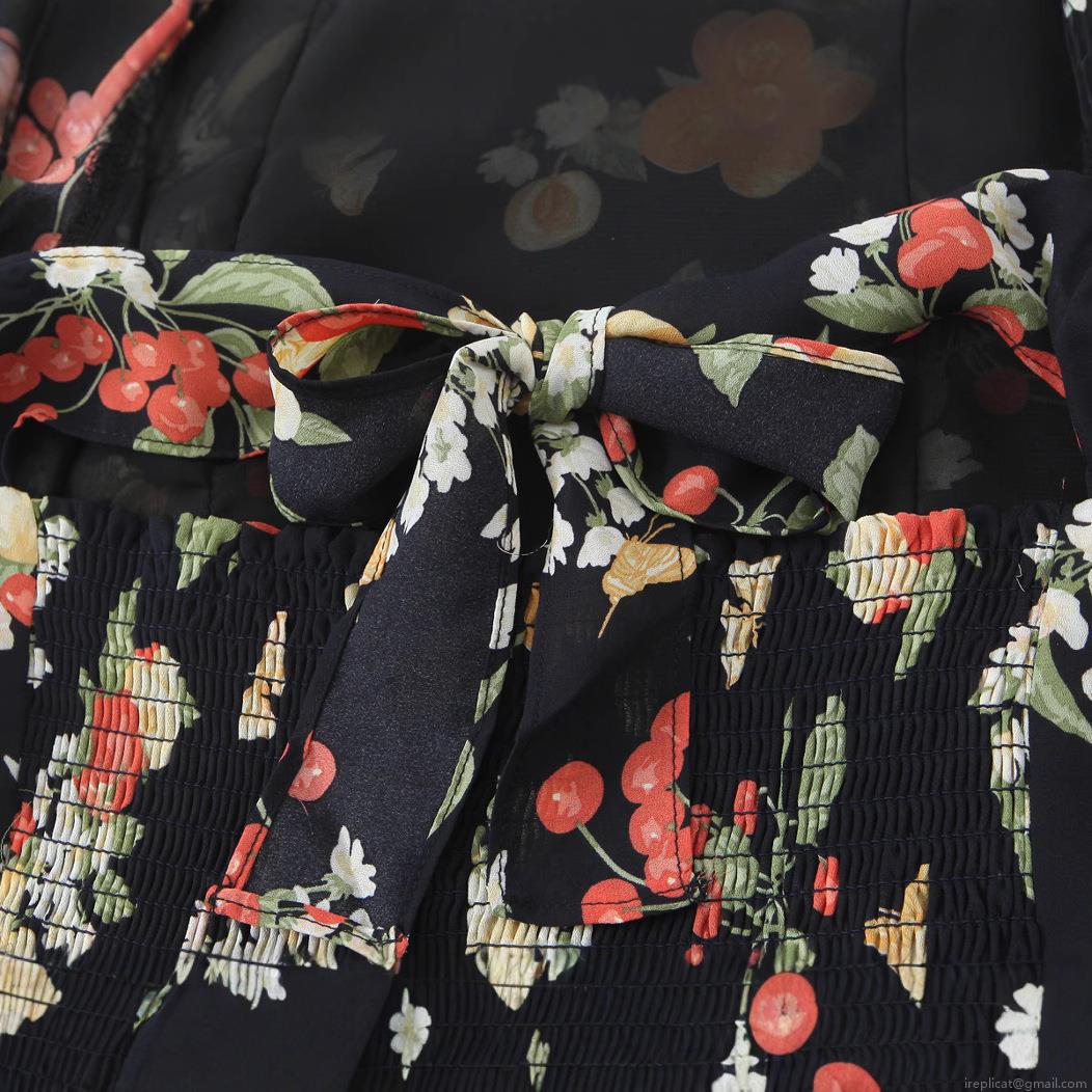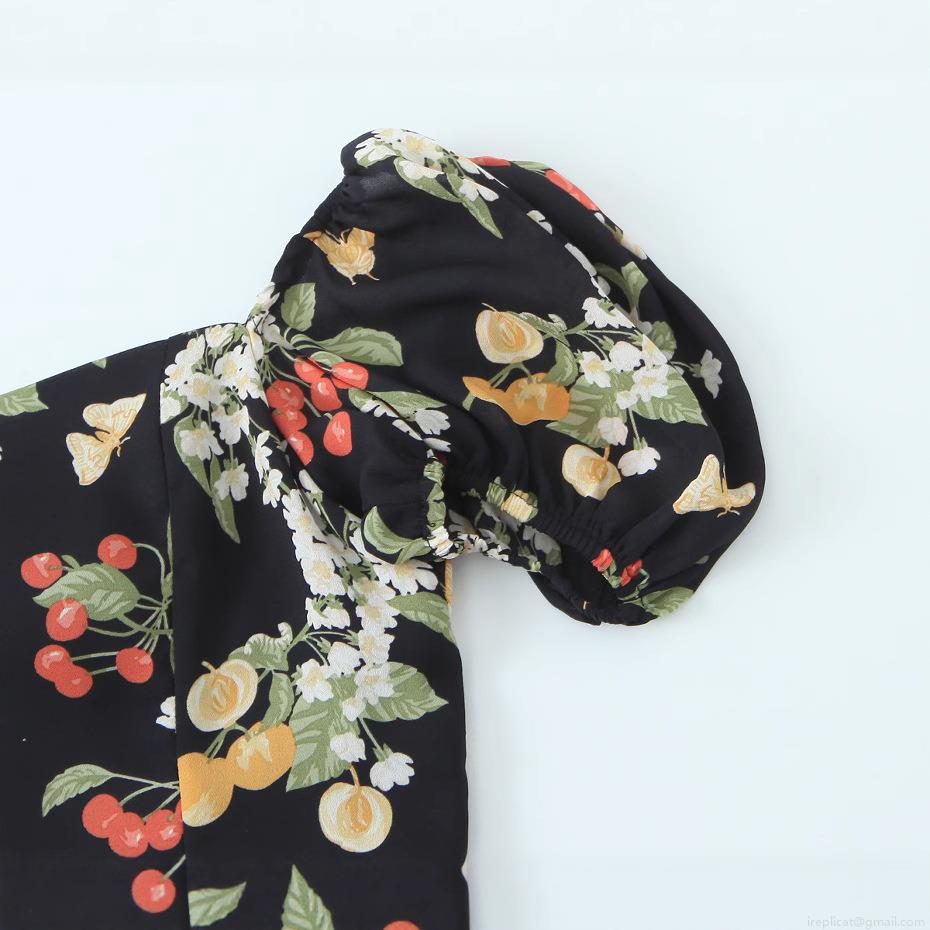 Cherry, Lemon, Pleats, Lace, Backless, Puff Sleeves, Floral Print, Square Collar