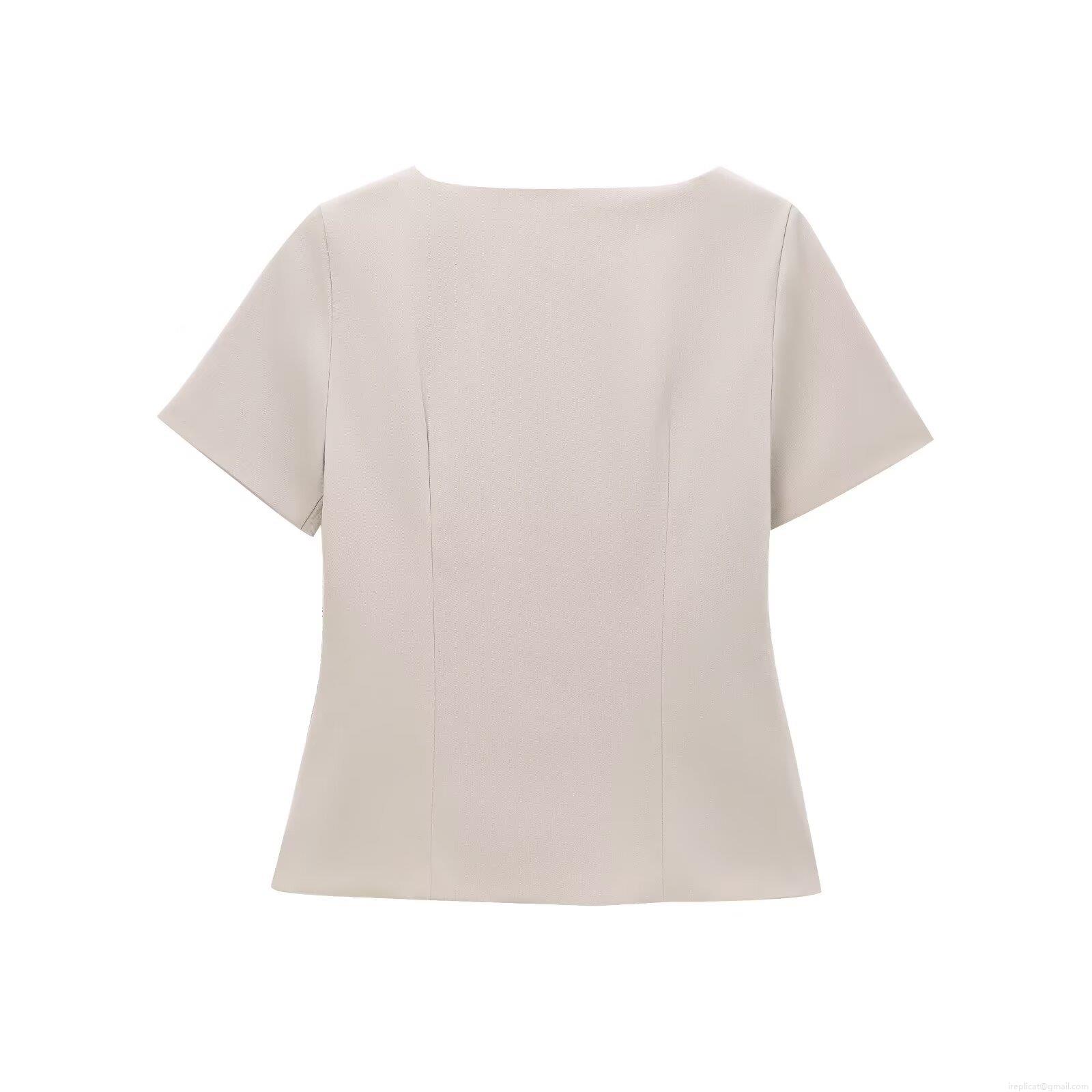 • Women's Square Neck Short Sleeve Button Down Top Elegant Slim Fit Solid Color Polyester T-Shirt Casual Blouse Fashion Streetwear For Women