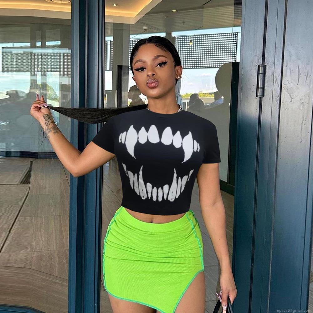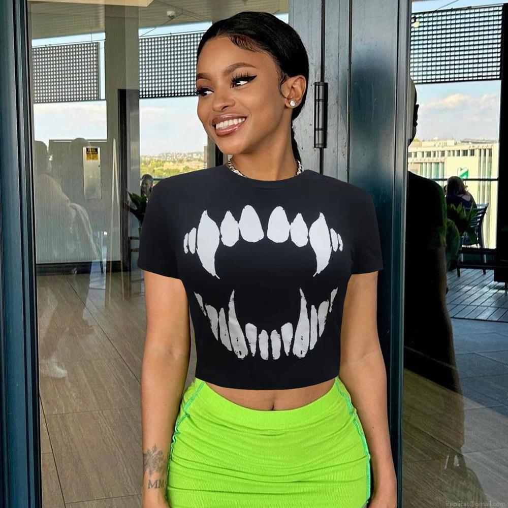 • Women's Streetwear Crop Top T-Shirt Cotton Blend Graphic Fang Teeth Print Round Neck Short Sleeve Slim Fit Summer Casual Tee Gothic Style Harajuku Fashion Apparel