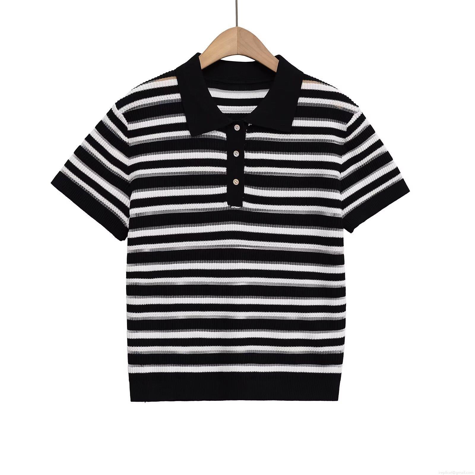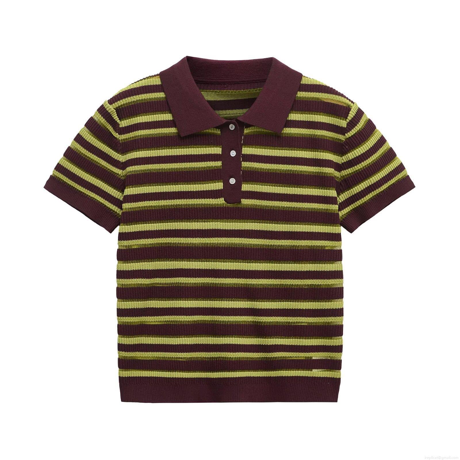 Women's Striped Knit Polo Shirt Short Sleeve Button Down Ribbed T-Shirt Loose Casual Retro Streetwear Summer Polyester Top For Ladies